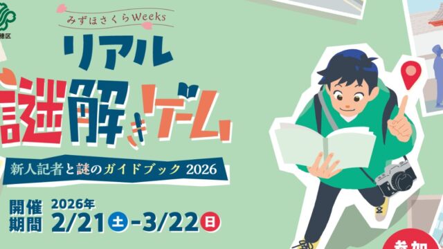 イベント瑞穂区を舞台にした『リアル謎解きゲーム 2026』が2/21(土)~3月22日(日)に開催!【瑞穂区イベント】 2026年2月20日 mizuhon https://mizuhon.com/wp-content/uploads/2025/03/見出しを追加.jpg みずほん