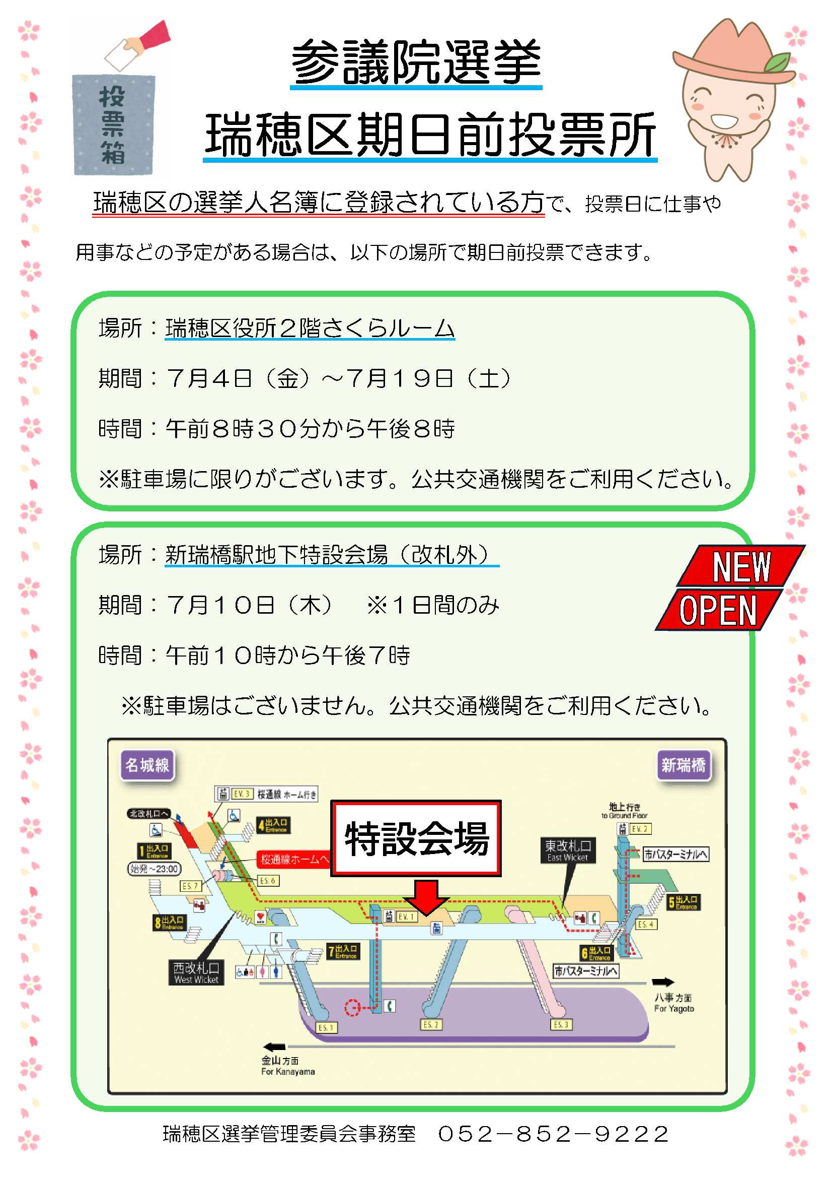 ニュース7/10(水)だけ!!新瑞橋に『参院選の期日前投票所』ができるみたい!【瑞穂区ニュース】 mizuhon 2025年7月9日 / 2025年7月9日 2025年7月20日(日)第27回参議院議員通常選挙が行われます。期日前投票所が7月10日(木)限定で、地下鉄新瑞橋駅に開設されるようです! 場所は新瑞橋駅の構内(改札の外) ↓詳しくはこちら↓ 瑞穂区役所以外でも、期日前投票ができるというのは便利ですね!お近くの方や新瑞橋駅を利用する方は、この機会に足を運んでみるのはいかがでしょうか? *この記事情報は2025年7月6日現在のものです。 *詳細につきましては主催者へご確認ください。 ニュース 新瑞橋