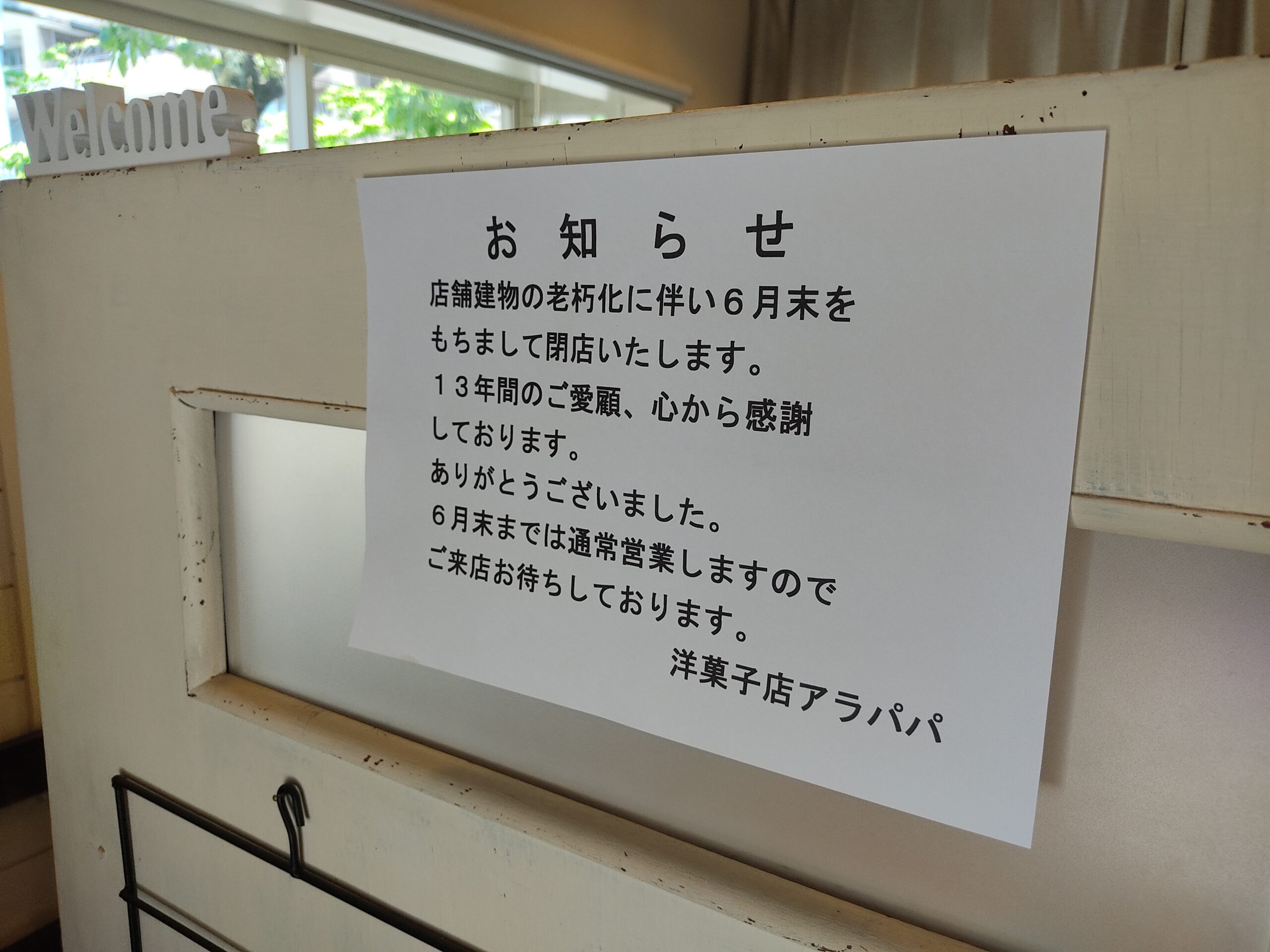 2024年6月末で瑞穂区・汐路町にある洋菓子店『アラパパ(alapapa)』が閉店のようです。