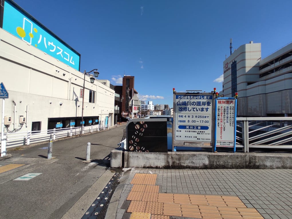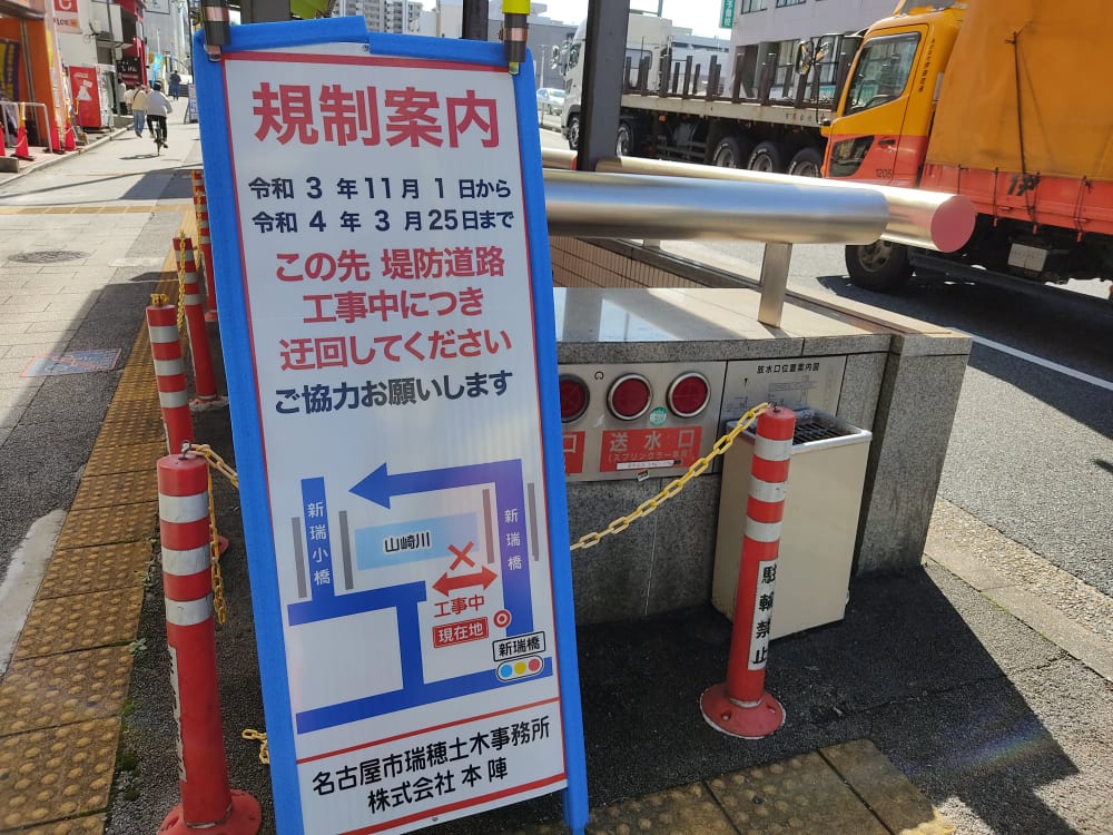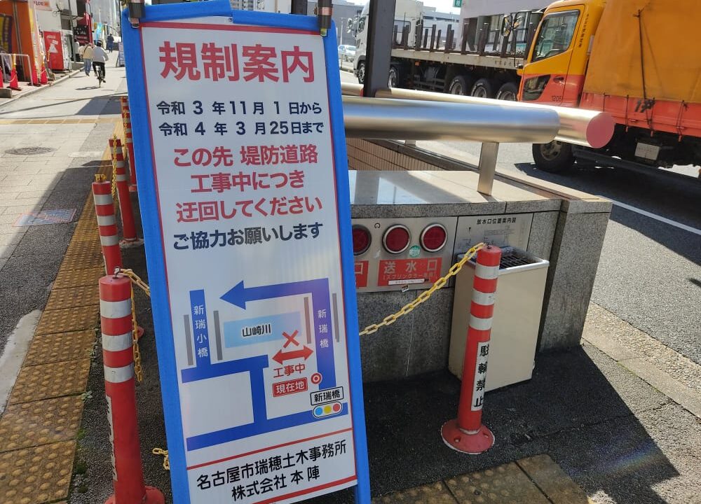 2021年11月1日(月)~2022年3月25日(金)まで、新瑞橋の山崎川沿いにある堤防道路の一部が交通規制されるようです。