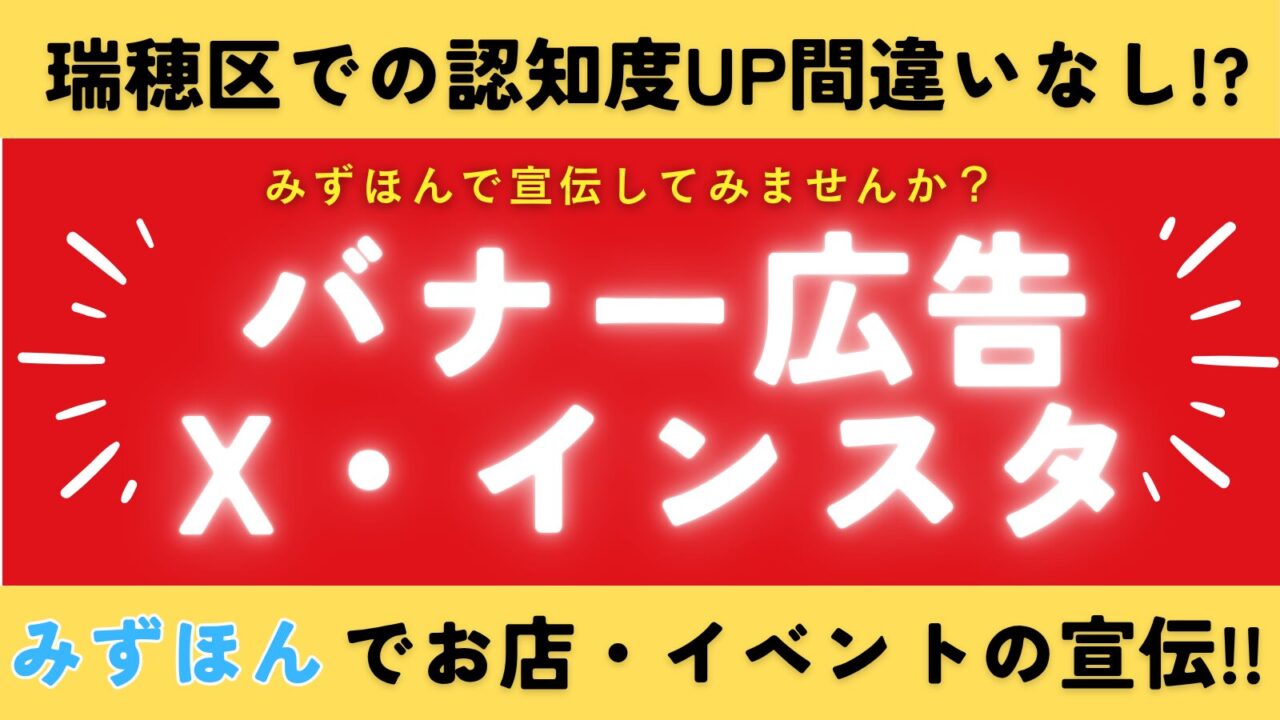 いまだけ、バナー広告お申込みの方にみずほんSNS(Xとインスタグラム)でのお店や会社のご紹介もプラスしてご提供します!認知度アップ、お店や会社の宣伝に!!