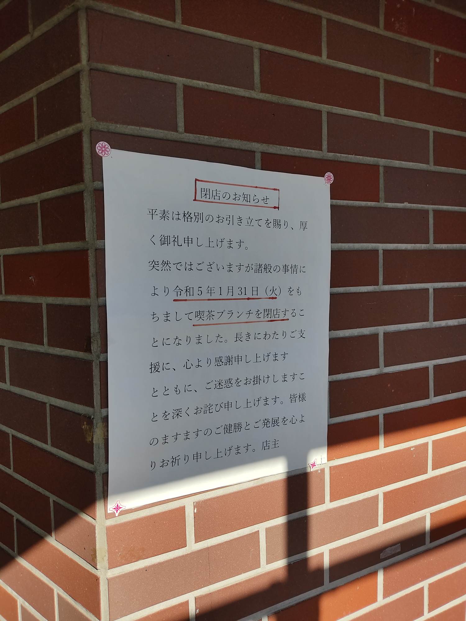 お店の前に閉店のお知らせが貼られていました。
