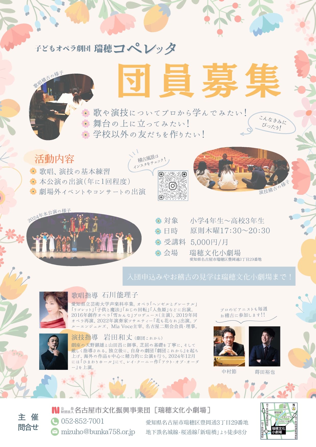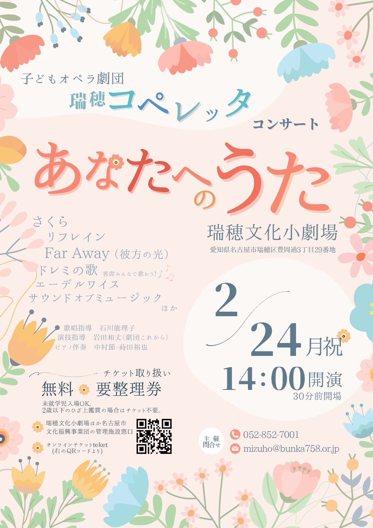 2025年2月24日(月・祝)瑞穂文化小劇場で『子どもオペラ劇団「瑞穂コペレッタ」コンサート「あなたへのうた」』が開催されます!