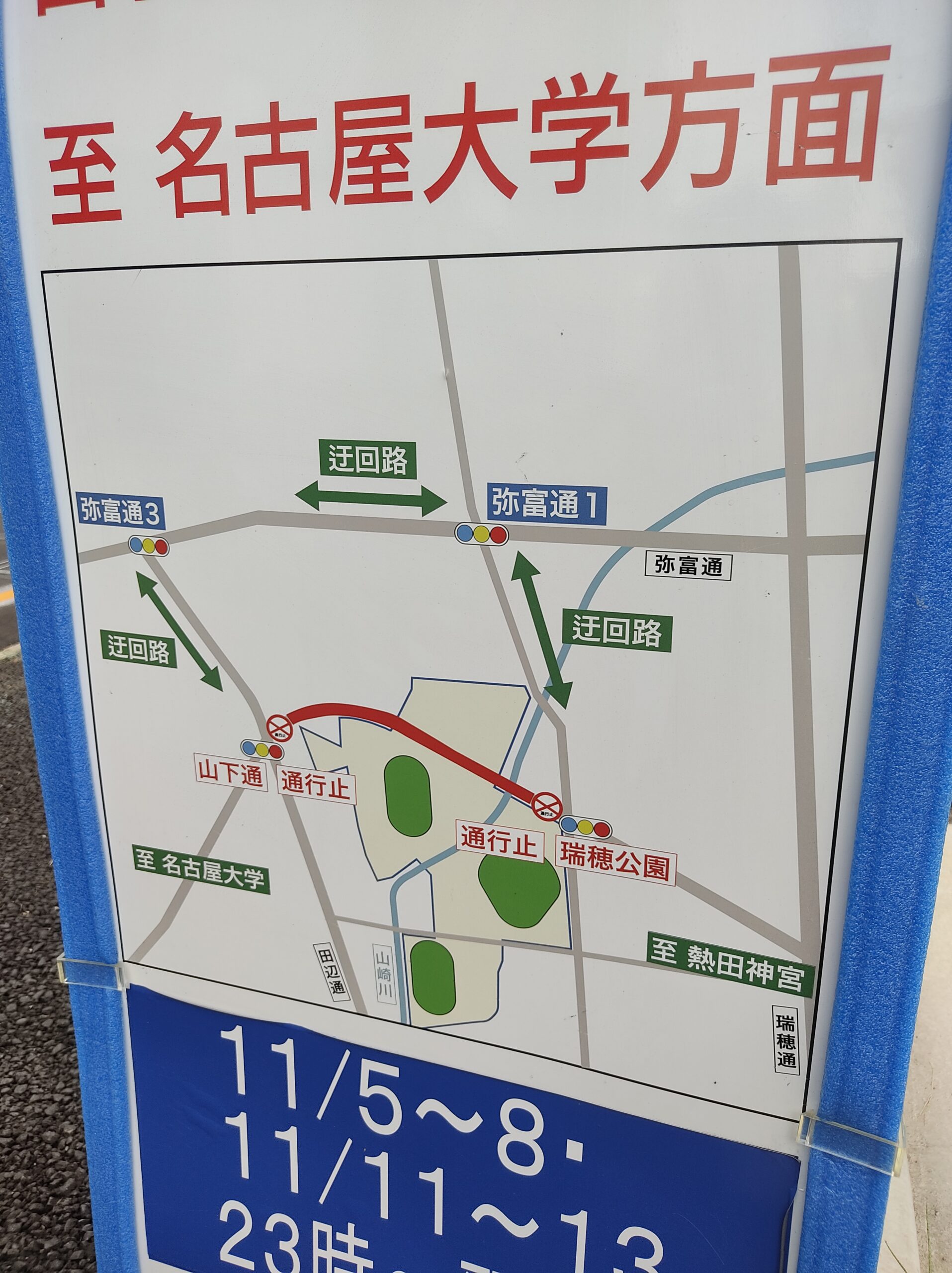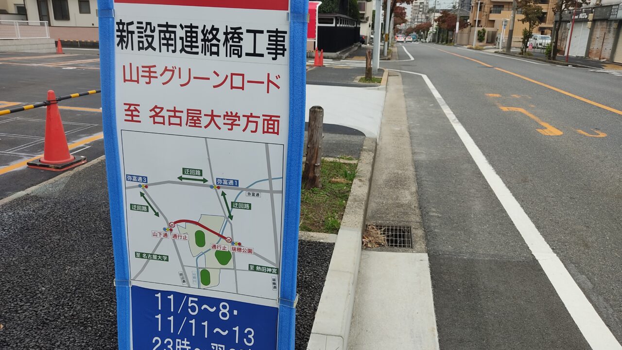 2024年11/5~11/8と11/11~11/13の23時-翌6時に『瑞穂公園~山下通』の交差点間が通行止になるようです。