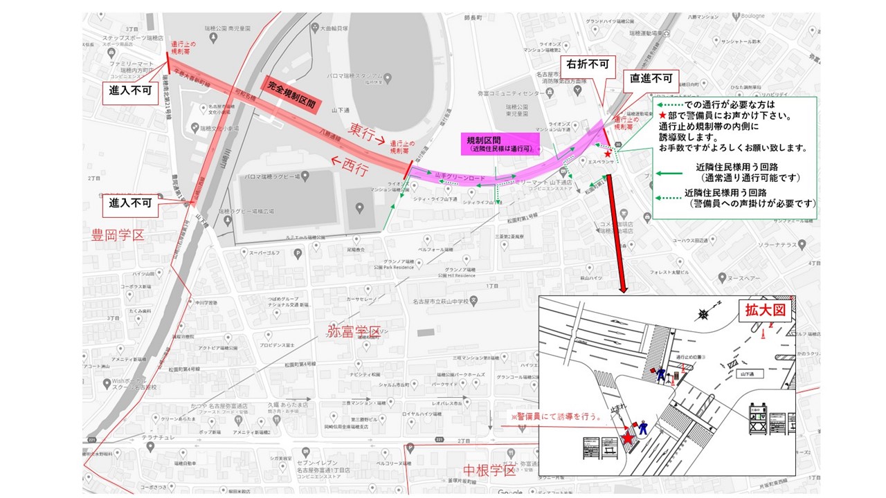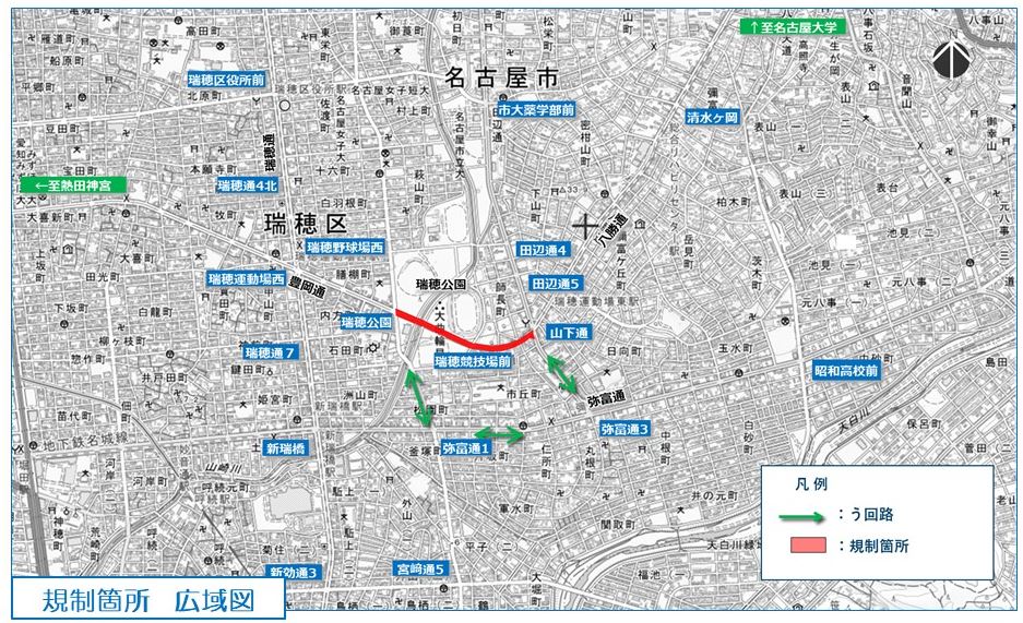 瑞穂図書館のある『瑞穂公園』~『山下通』の交差点まで規制区間となります。