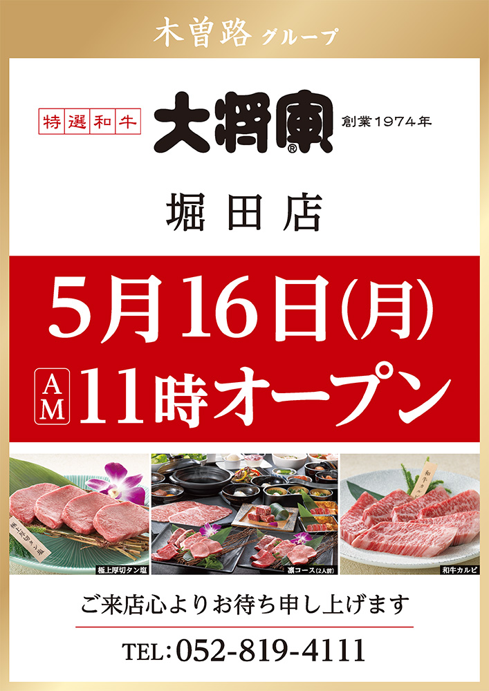 2022年5月16日(月)『特選和牛・大将軍 堀田店』がオープン!新しい焼肉屋さんが瑞穂区に登場です。