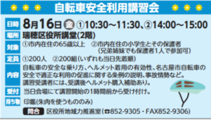 8月16日に瑞穂区役所で開催される『自転車安全利用講習会』はいかがでしょうか?