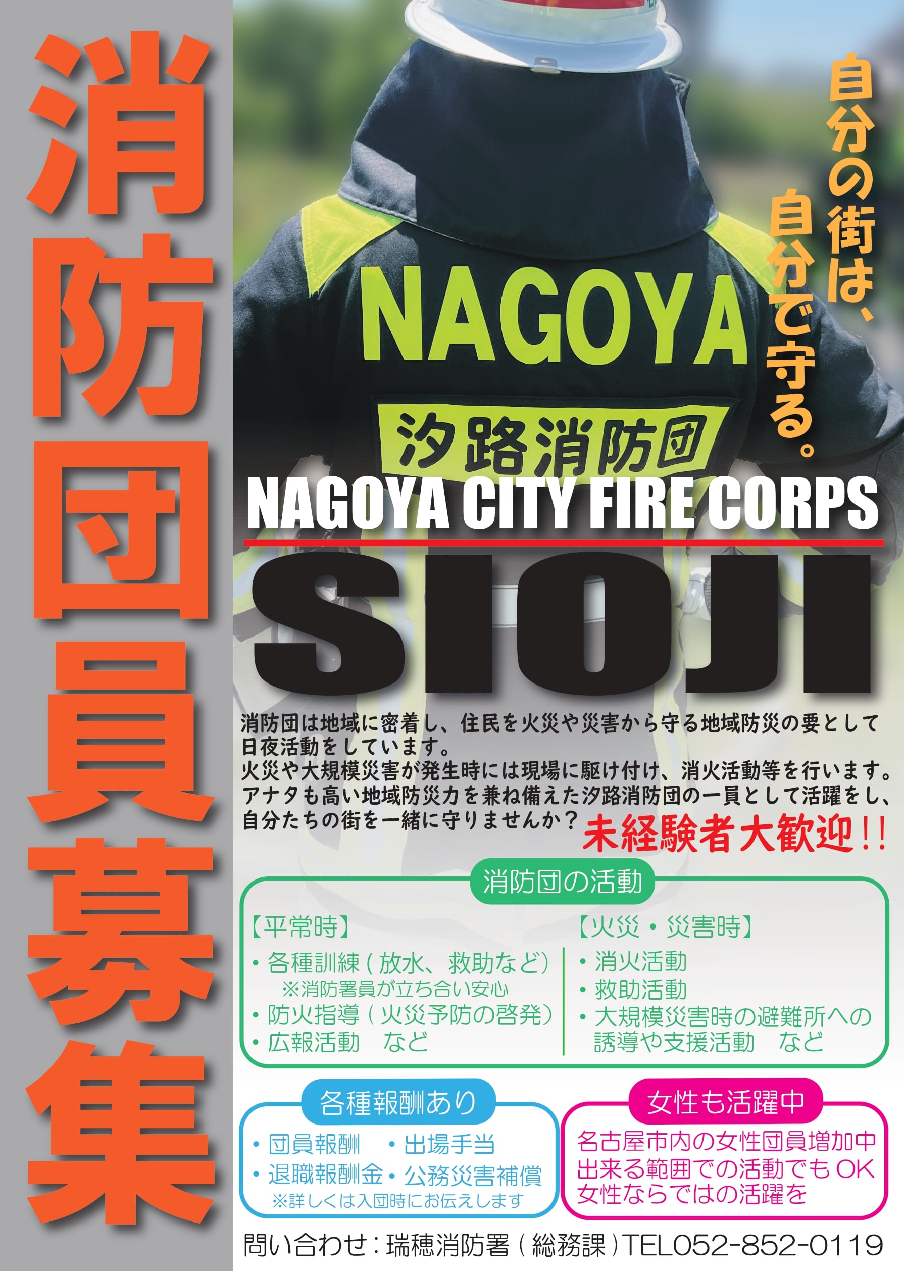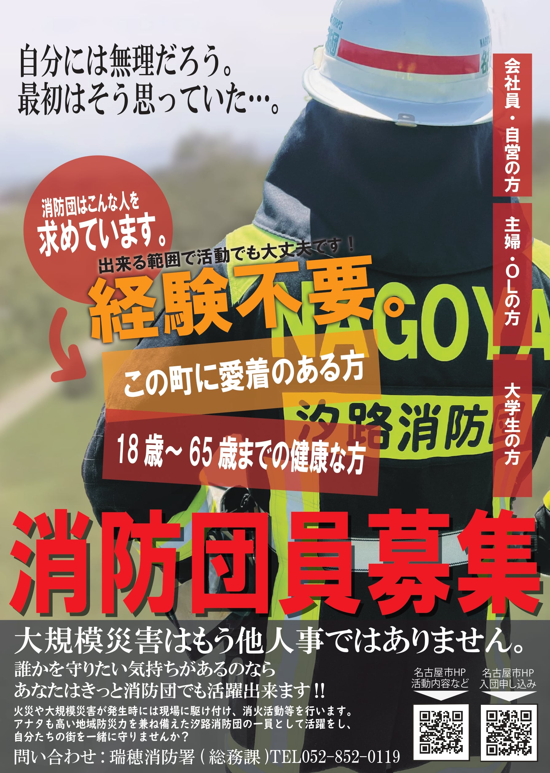 瑞穂区の消防団に入団をご希望される方は、瑞穂消防署総務課までお問い合わせください。(電話番号052-852-0119)また、消防団員募集のサイトもぜひご覧ください。