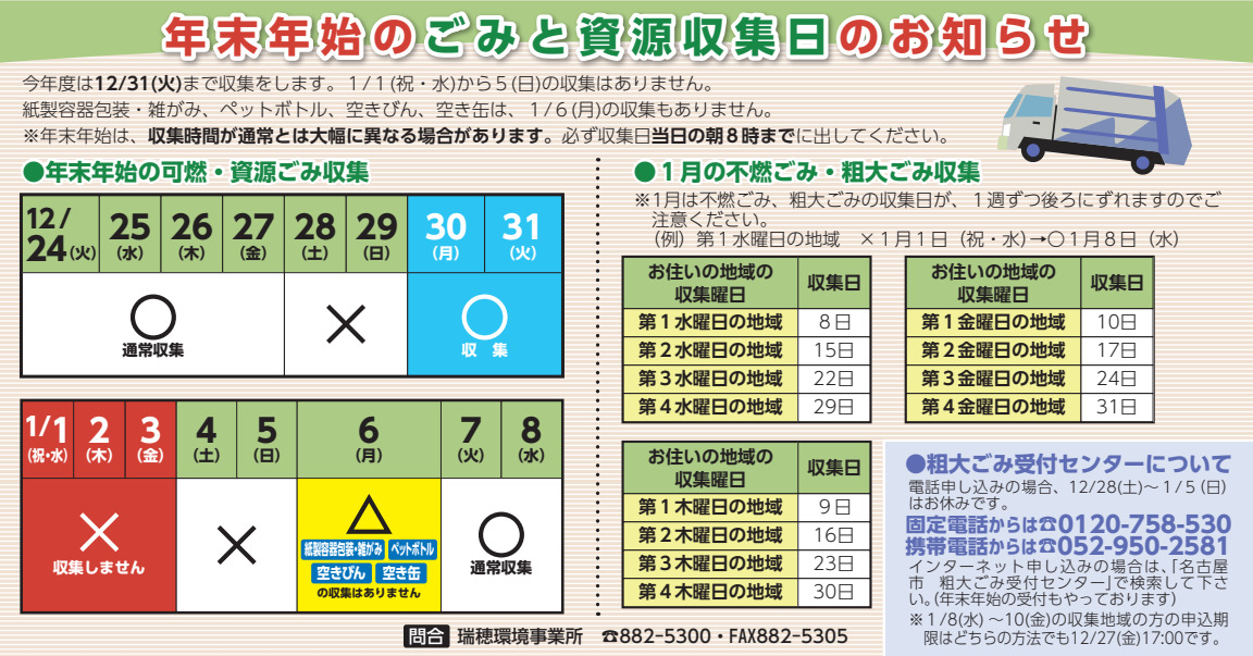 お役立ち情報要チェック!2024-2025年『年末年始のごみと資源収集日』【瑞穂区ニュース】 mizuhon 2024年12月17日 / 2024年12月17日 いよいよ2024年も年の瀬!大掃除がどの家庭でも行われる中で気になるのが『年末年始のごみ』2024年、瑞穂区の年末年始のごみの収集スケジュールが発表されていました! *この画像は広報なごやからの転載です。 きれいサッパリ、お家を片付けて気持ちよく新年を迎えましょう!! *この記事情報は2024年12月12日現在のものです。 *詳細につきましては市役所HPをご確認ください。 お役立ち情報 ニュース 瑞穂区