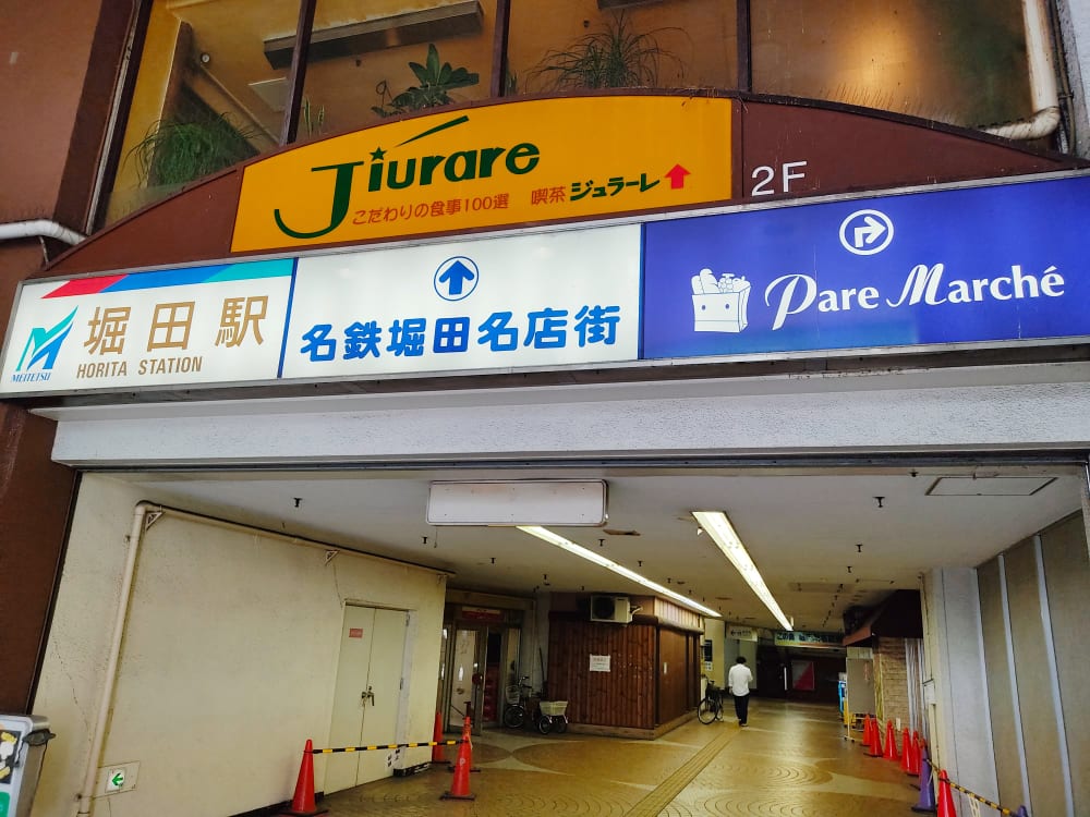 解体工事が進む名鉄堀田名店街の入口からすぐのところにお店はあります。