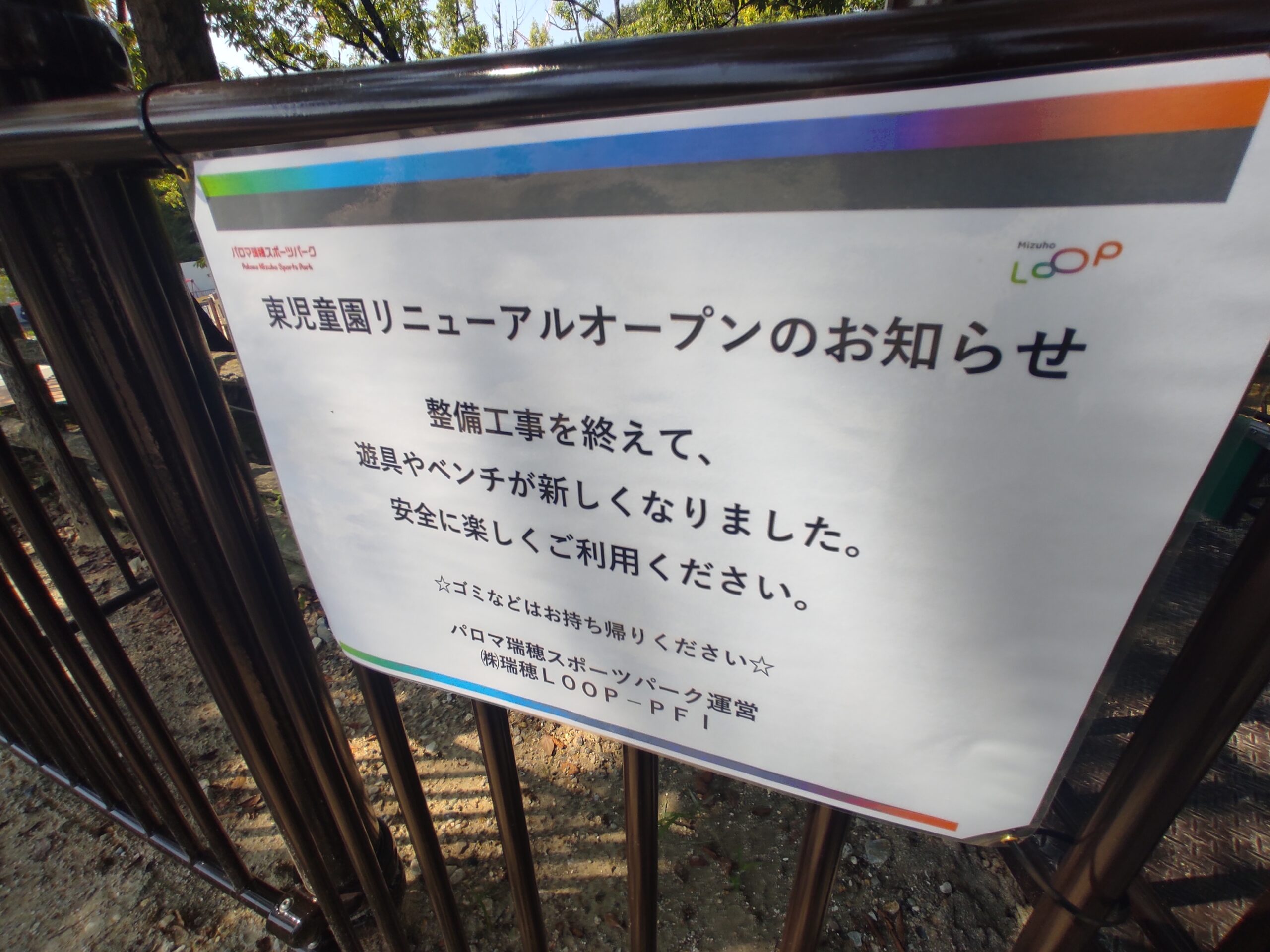 2024年9月1日(日)、パロマ瑞穂スタジアムの東側(瑞穂運動場東駅方面)にある『東児童園』がめちゃくちゃキレイになってリニューアルオープンしていました!