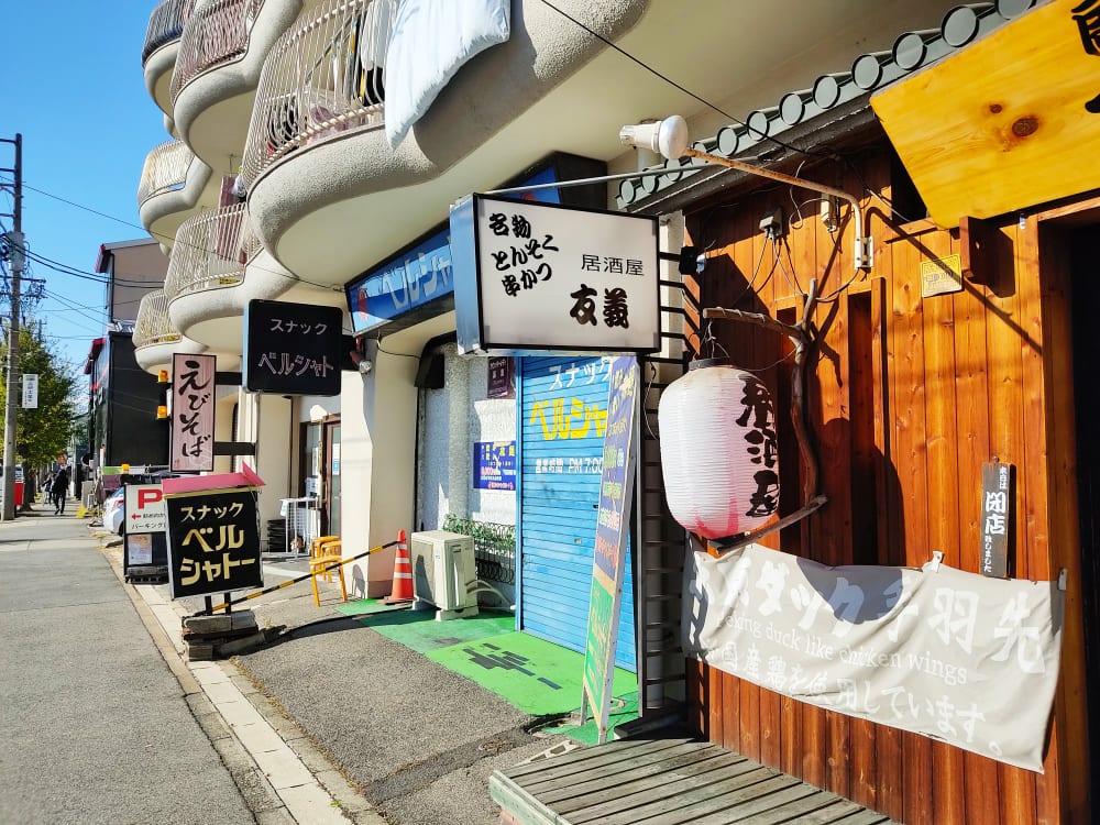 味のあるお店の並びに『えびそば』の大きな文字が見えます。