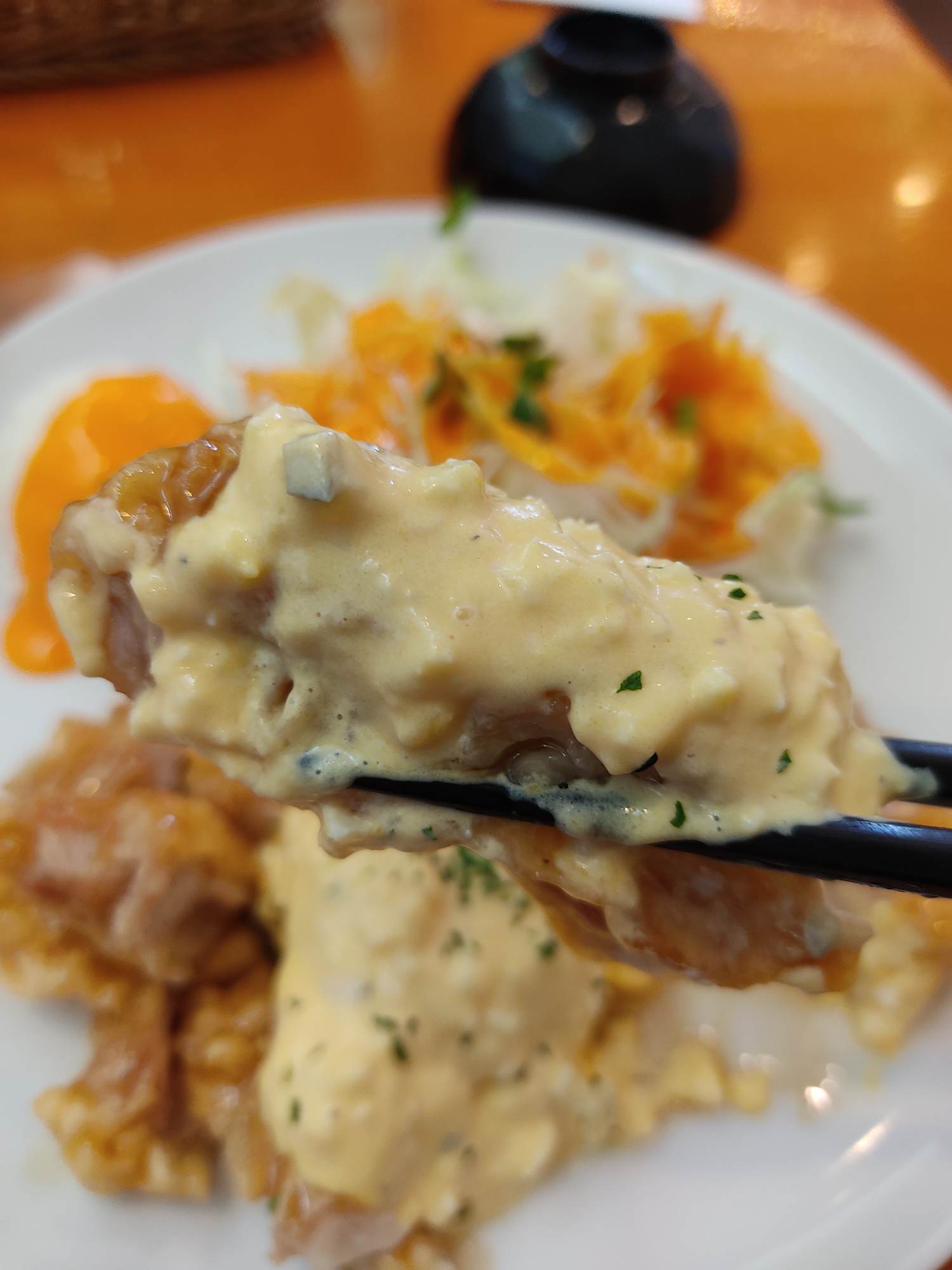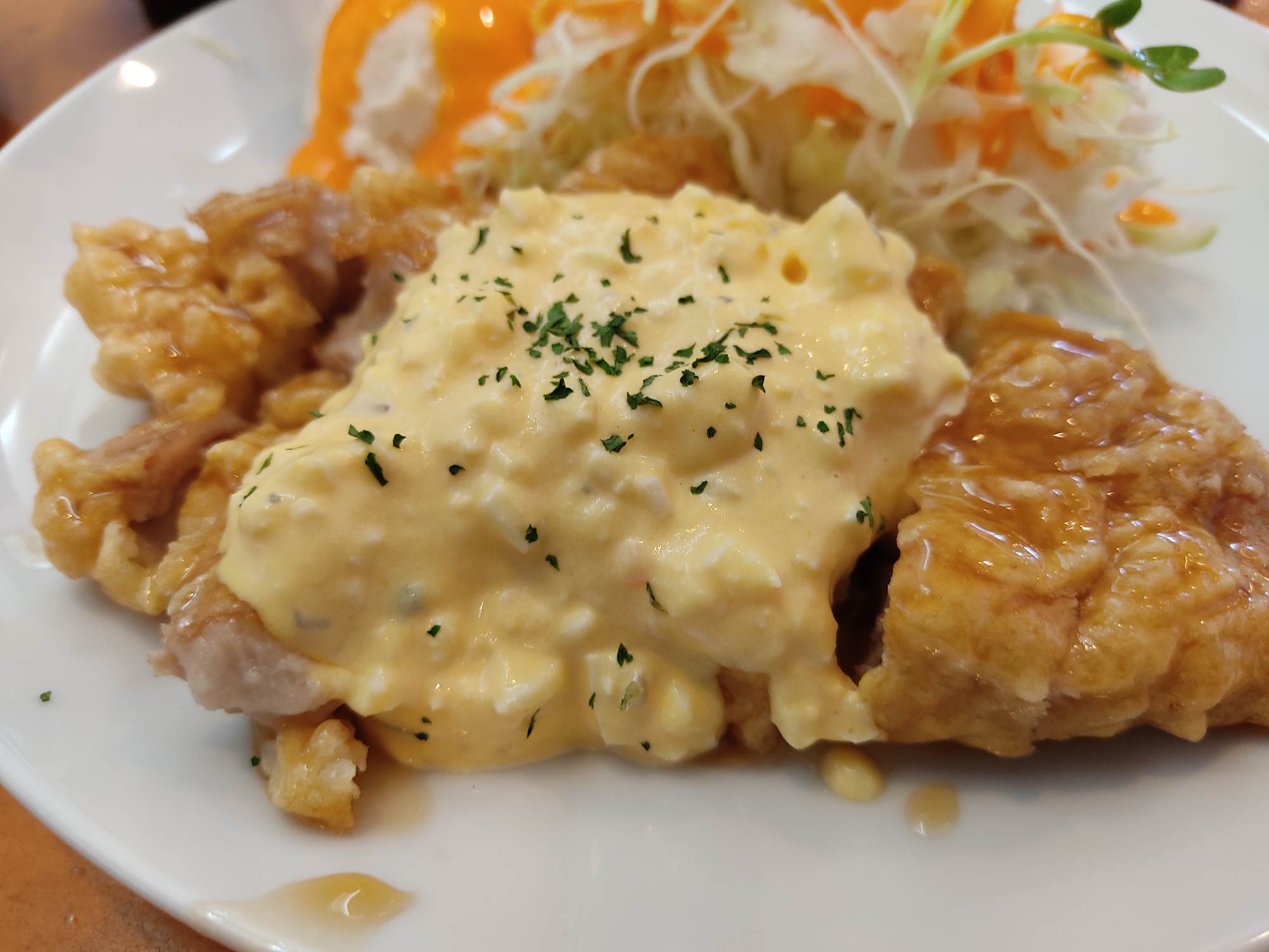玉子たっぷりのソースと甘旨いチキンが絶妙なおいしさ!