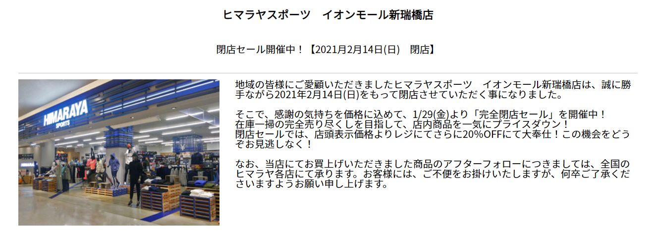 2021年2月14日(日)の営業をもって『ヒマラヤスポーツ イオンモール新瑞橋店』が閉店するようです。1月19日(金)からは「完全閉店セール」も行われているようです。