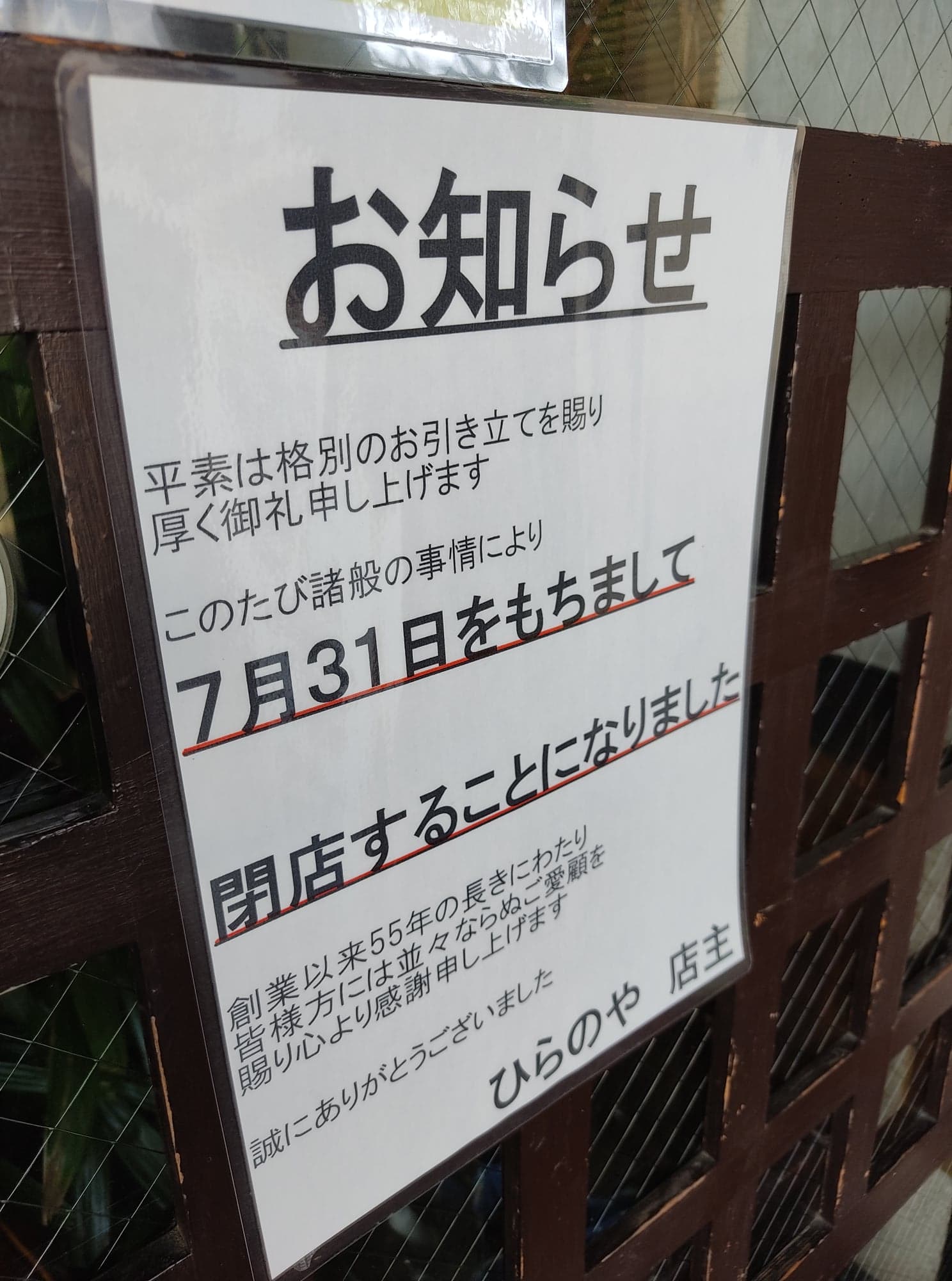 2022年7月31日(日)の営業をもって、瑞穂区・陽明小学校の前にある、そば・きしめんのお店『ひらのや』が閉店です。