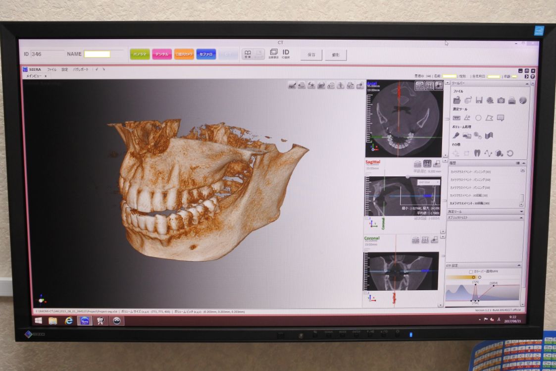 そして、インプラント治療は、細かい部位まで正確に診査することができる「CT撮影装置」を用いて診断を行った後、手術を行います。