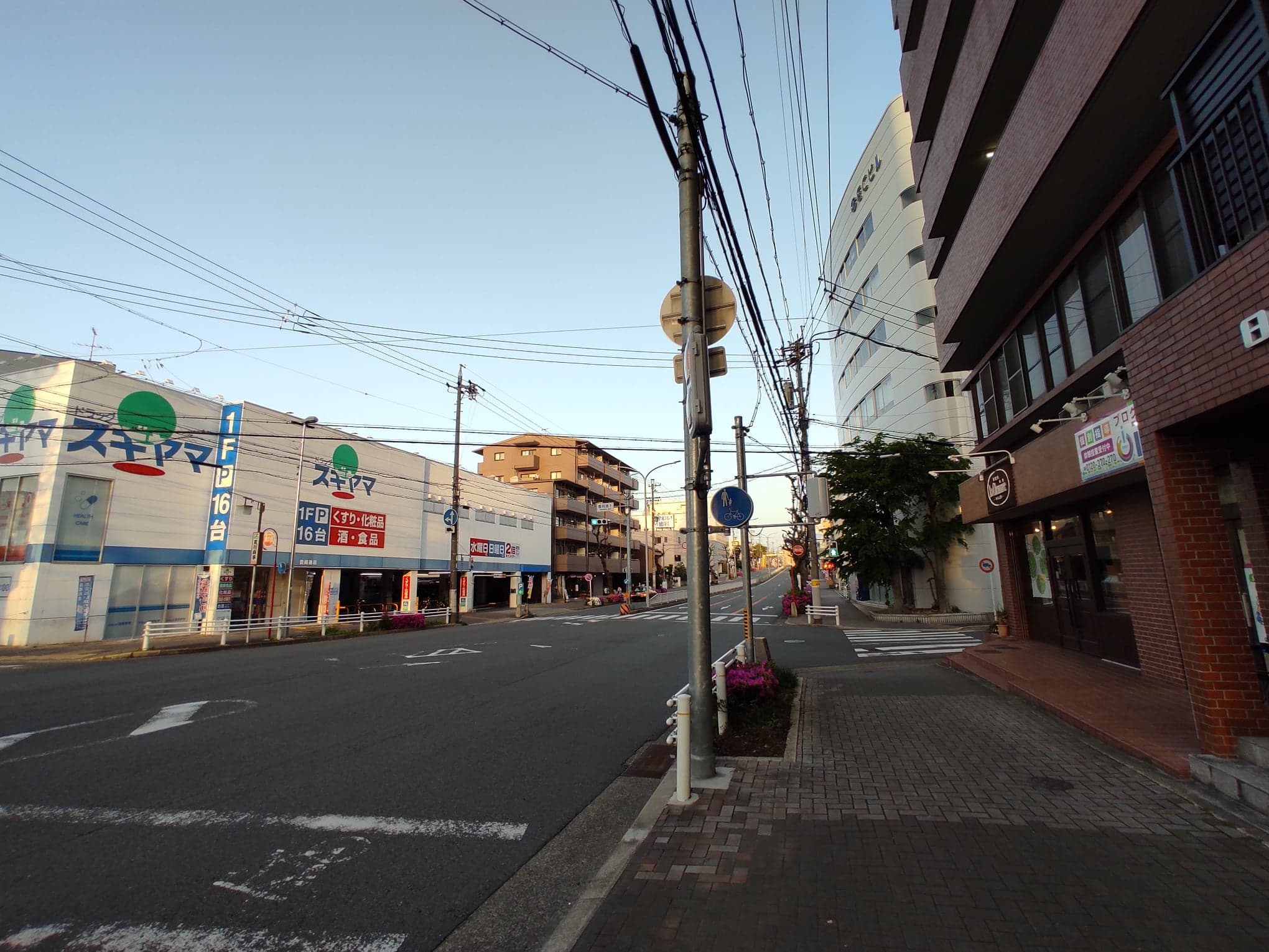 豊岡通沿いで交差点の斜め向かいには『ドラッグ スギヤマ 豊岡通店』と『プーフレカンテ』があるところです。