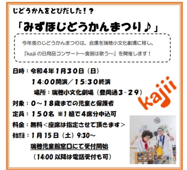 1/30(日)『みずほじどうかんまつり』が瑞穂文化小劇場で開催!日用品楽器『kajii』のコンサート!!【瑞穂区イベント】