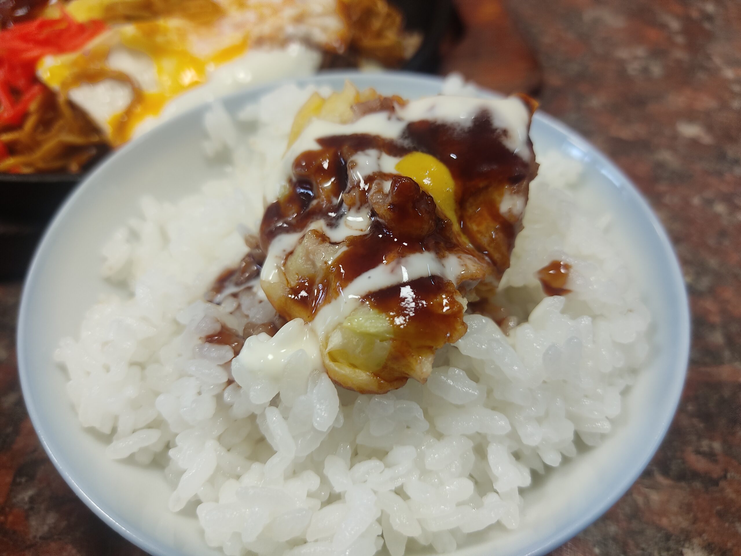 お好み焼きをご飯の上に載せて食べる!なんか贅沢な気分!