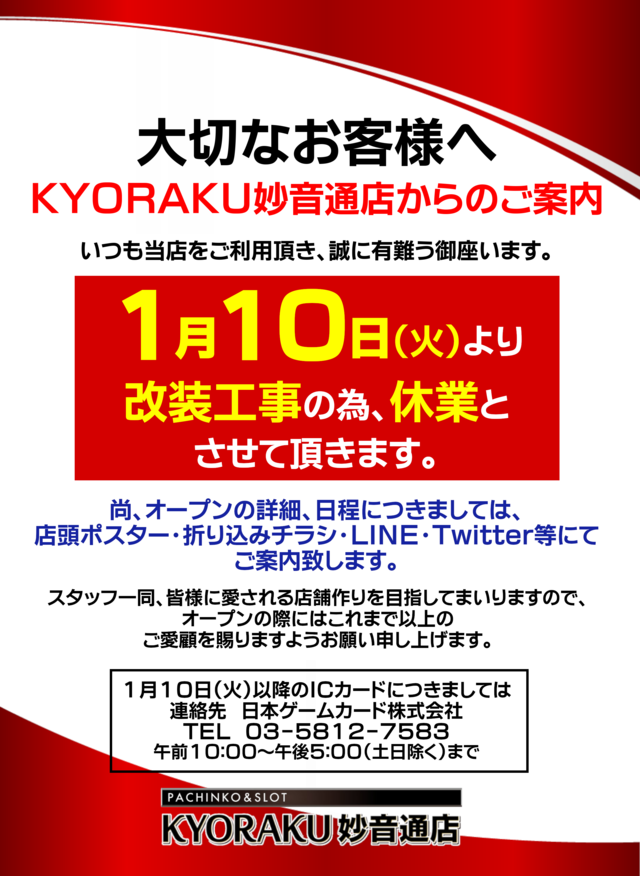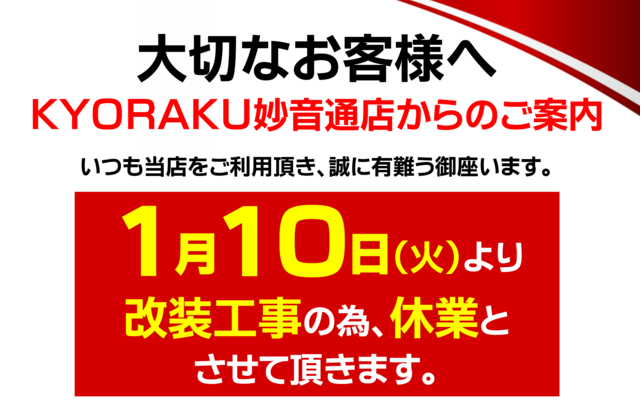 2023年1月10日(火)から、新瑞橋の西側にあるパチンコ屋さん『KYORAKU 妙音通店』が改装工事のため休業のようです。