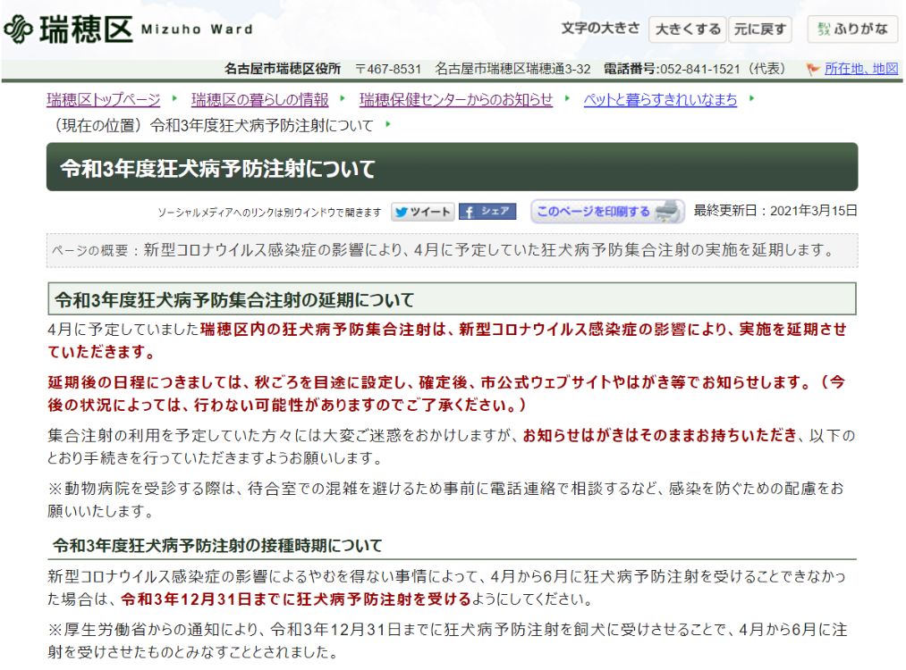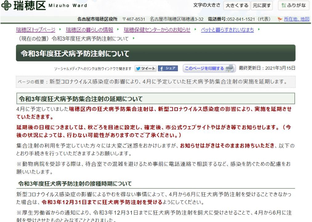 令和3年度の『狂犬病の予防集合注射』は4月に予定されていましたが、新型コロナウイルス感染症の影響により、実施が延期されるようです。