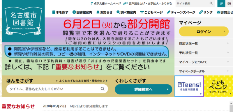 【部分開館に伴うご協力のお願い(名古屋市図書館ホームページ)】