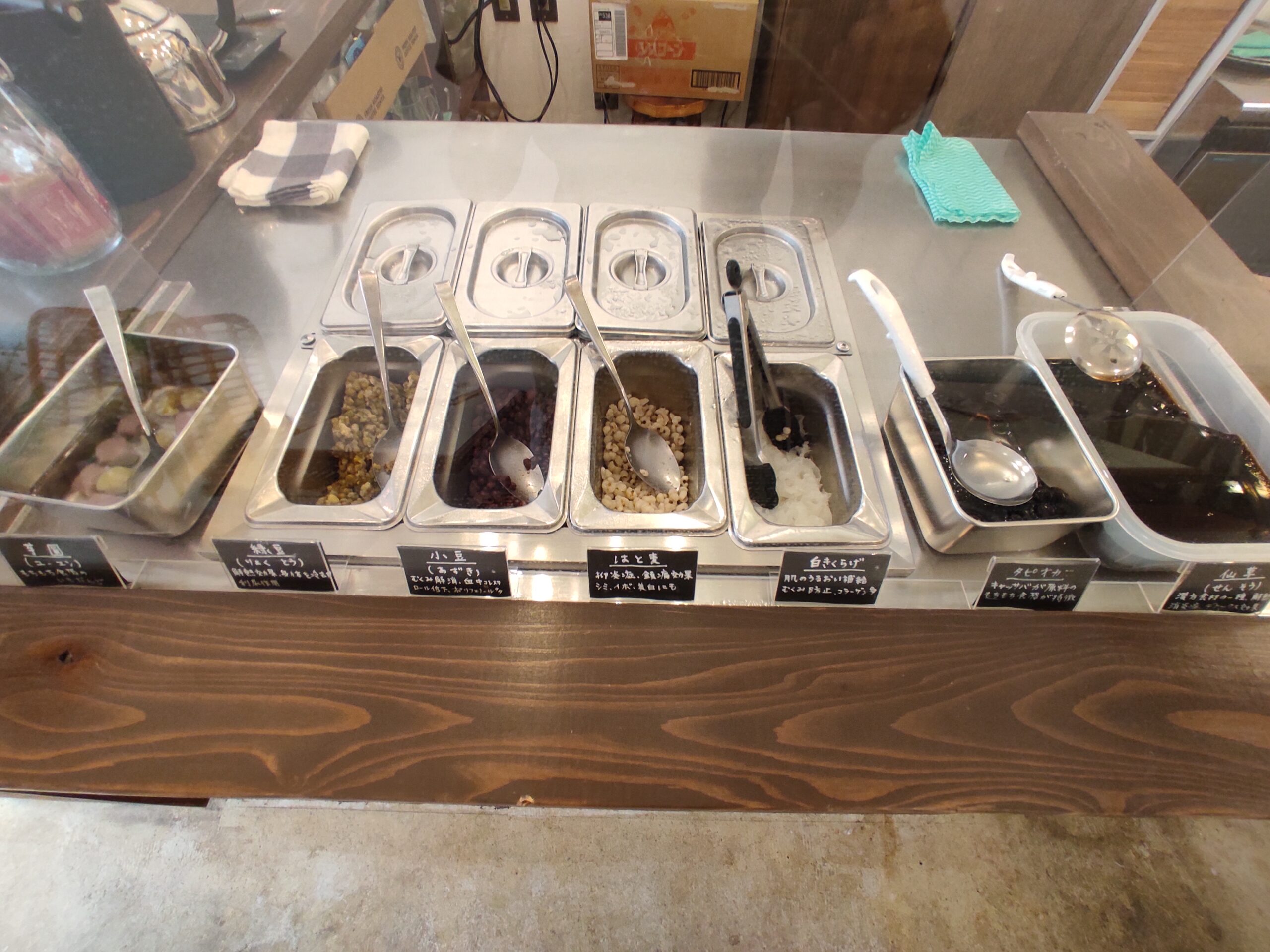 タピオカ、白きくらげ、はと麦など様々な具材を自分好みで選ぶことが出来ます。