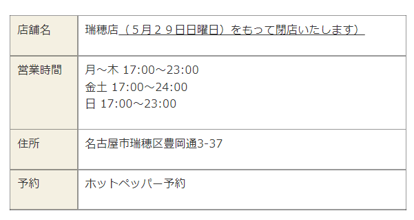 2022年5月29日(日)の営業をもって、豊岡通沿いで営業していた『元祖やきとり家 美濃路 瑞穂店』が閉店のようです。