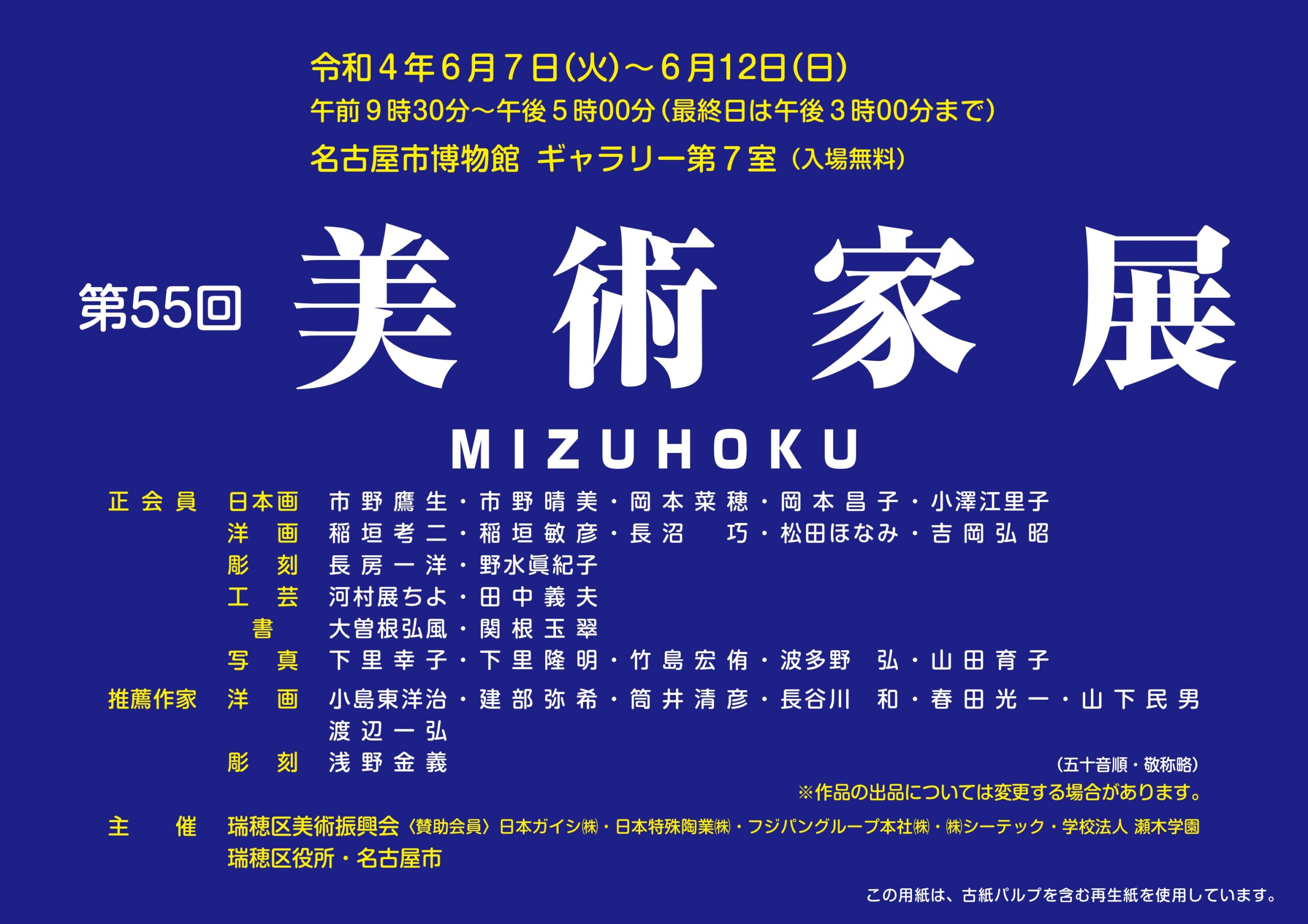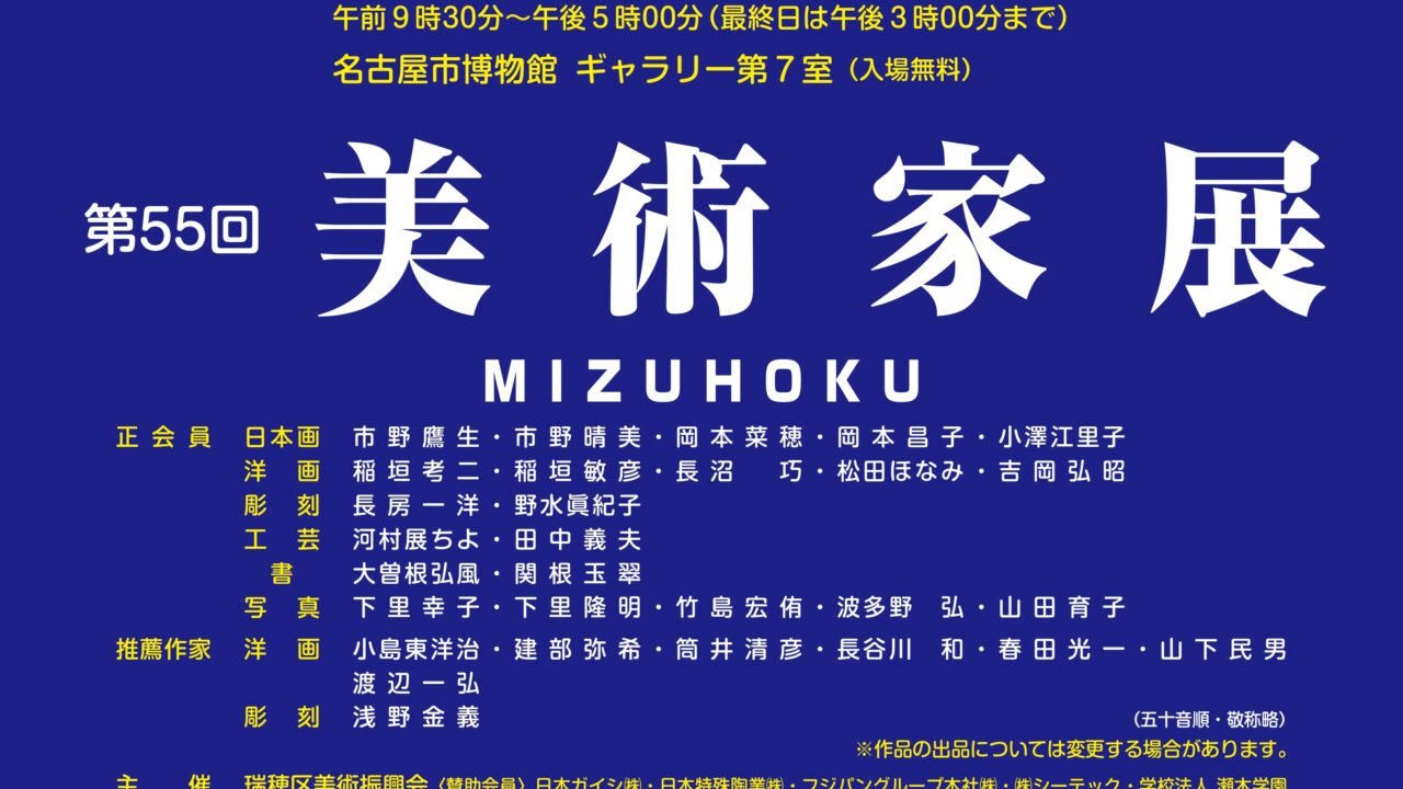 イベント名古屋市博物館『瑞穂区美術家展』2022年は6/7~12に開催【瑞穂区イベント】 mizuhon 2022年5月27日 / 2022年5月27日 2022年6月7日(火)~12日(日)まで、名古屋市博物館で『瑞穂区美術家展』が開催されます。 ↓場所はこちら↓ 『美術家展』は、瑞穂区内在住または在勤の美術家の方々の作品が展示されるイベントです。2022年の大会案内はこちら↓ *この画像は瑞穂区役所ホームページからの転載です。 *この記事情報は2022年5月24日現在のものです。 *詳細につきましては主催者へご確認ください。 イベント 名古屋市博物館 瑞穂区