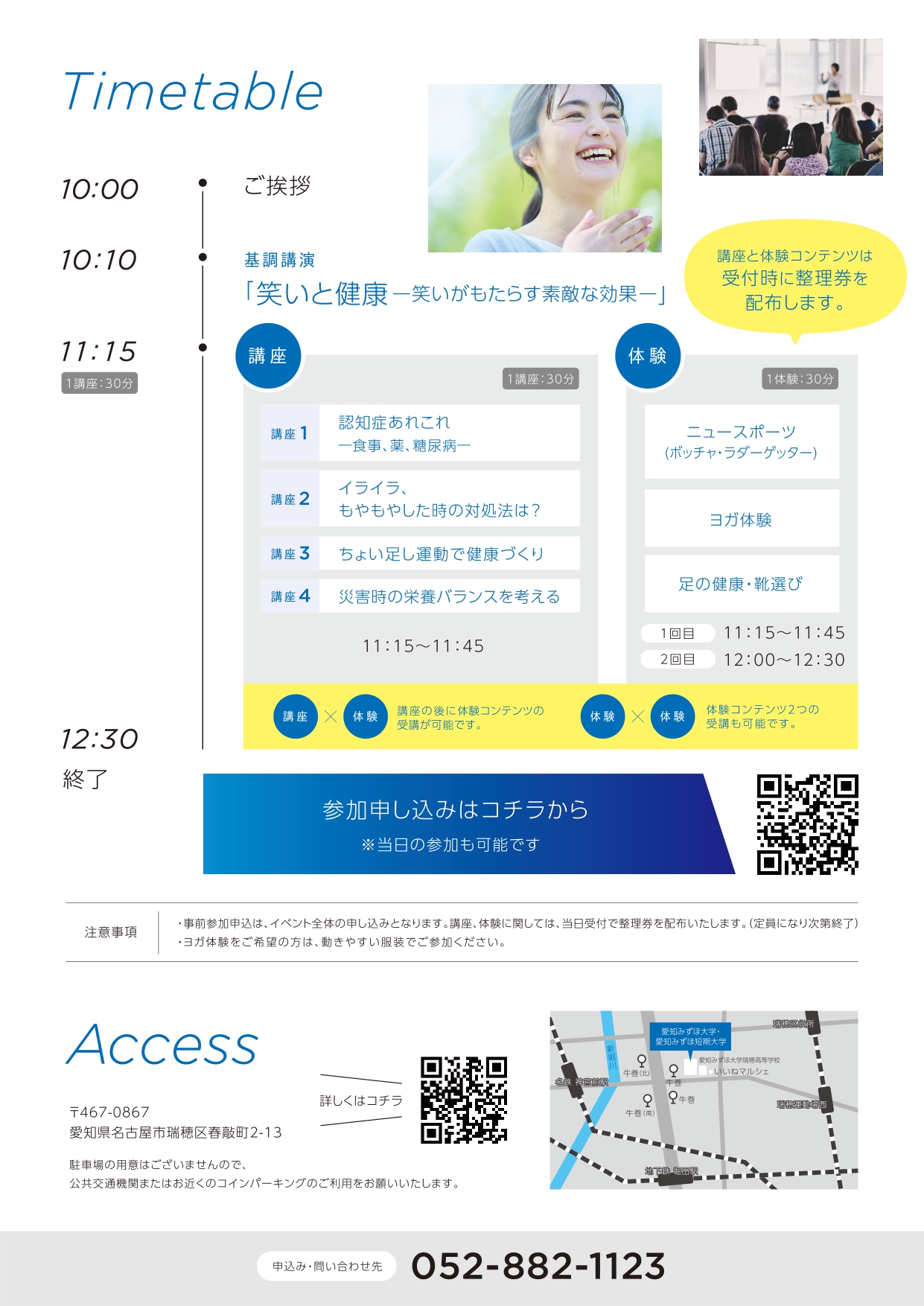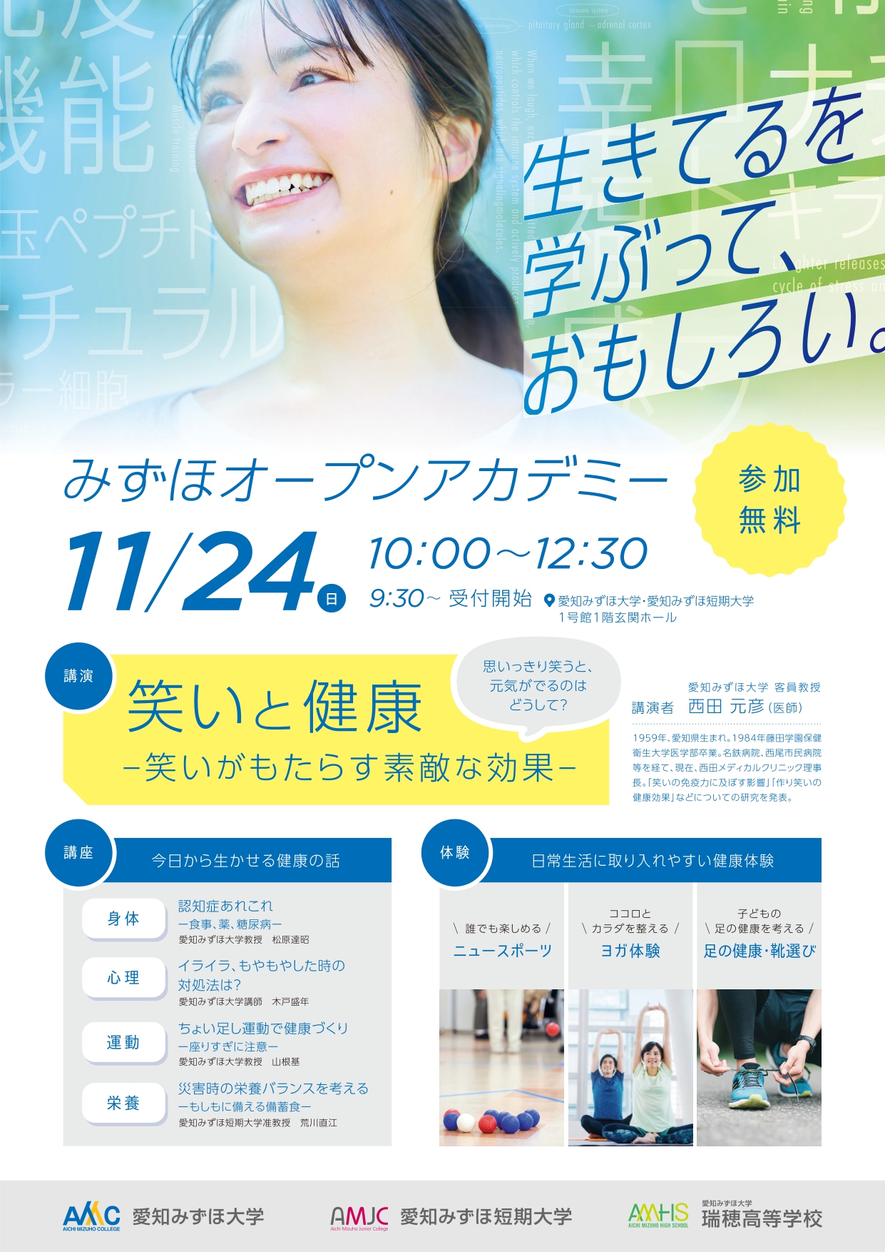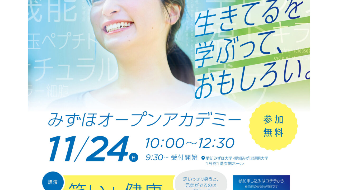 イベント11/24(日)愛知みずほ大学『オープンアカデミー』で健康に関する講座や体験会が開催!【瑞穂区イベント】 mizuhon 2024年11月11日 / 2024年11月11日 2024年11月24日(日)、瑞穂区にある愛知みずほ大学で『オープンアカデミー』が開催されます! ↓開催場所はこちら↓ 健康で過ごすための学びが多そうなイベントですね!個人的には”笑いと健康”の関係について聞いてみたい!!ぜひ、足を運んでみてください!! *この記事情報は2024年11月9日現在のものです。 *詳細につきましては主催者へご確認ください。 イベント 牛巻