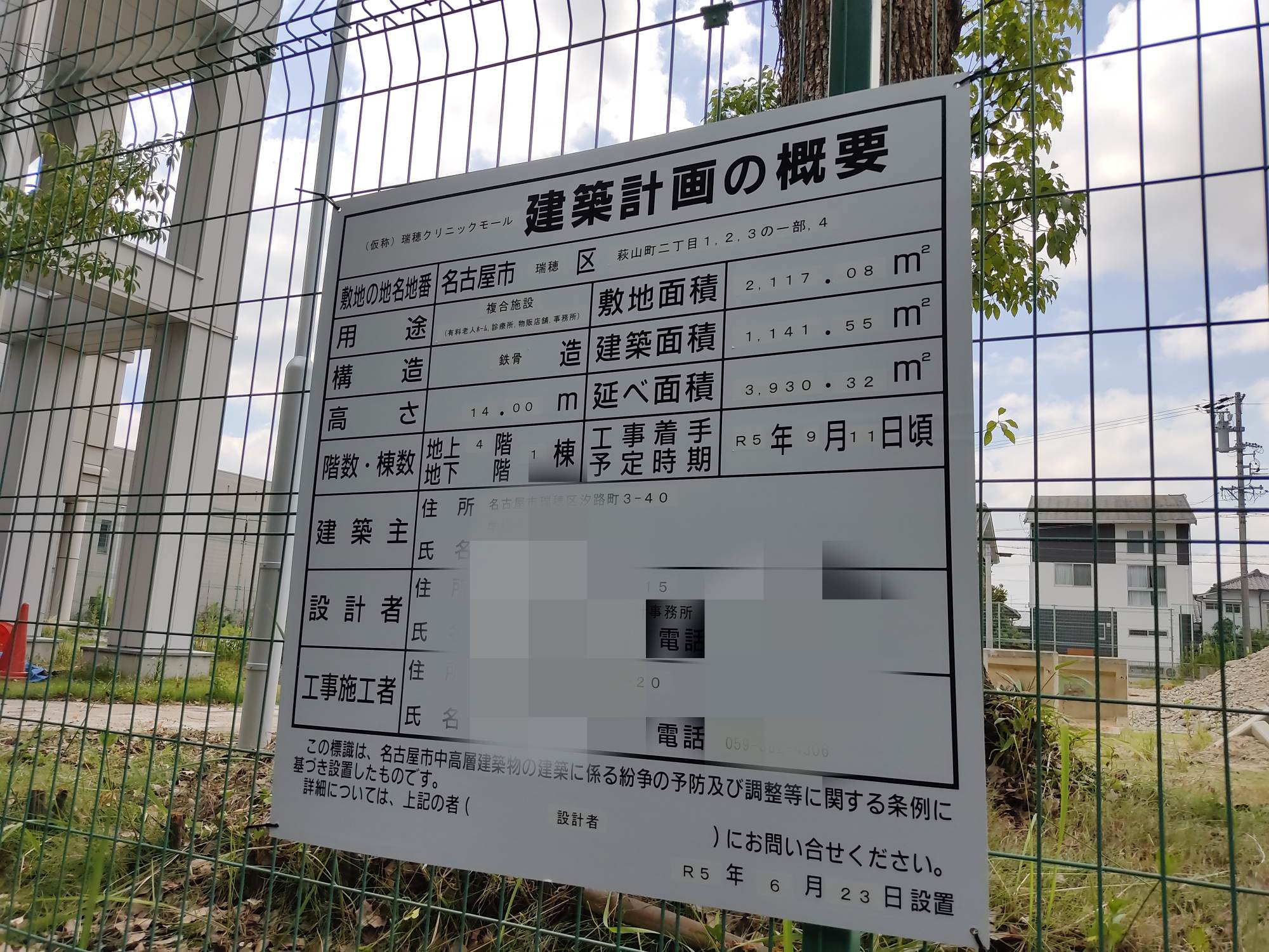 診療所、有料老人ホーム、お店が入る新しい複合施設『瑞穂クリニックモール(仮)』の建築計画の看板が立てられていました。