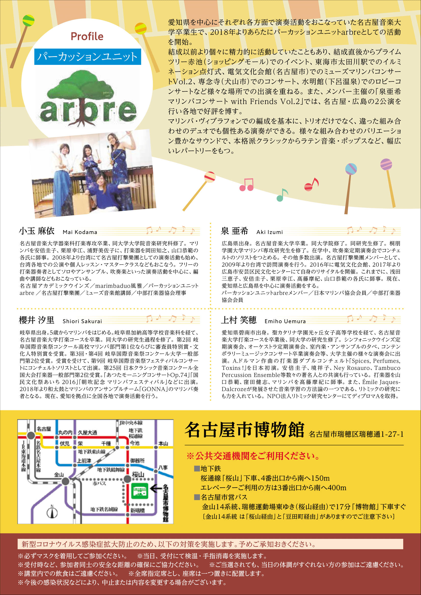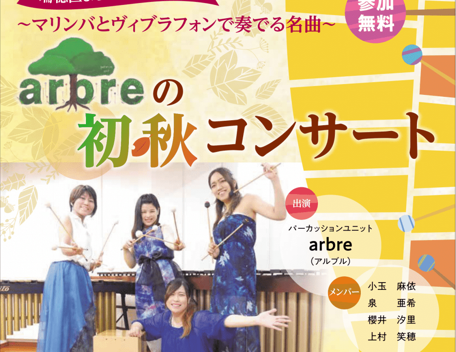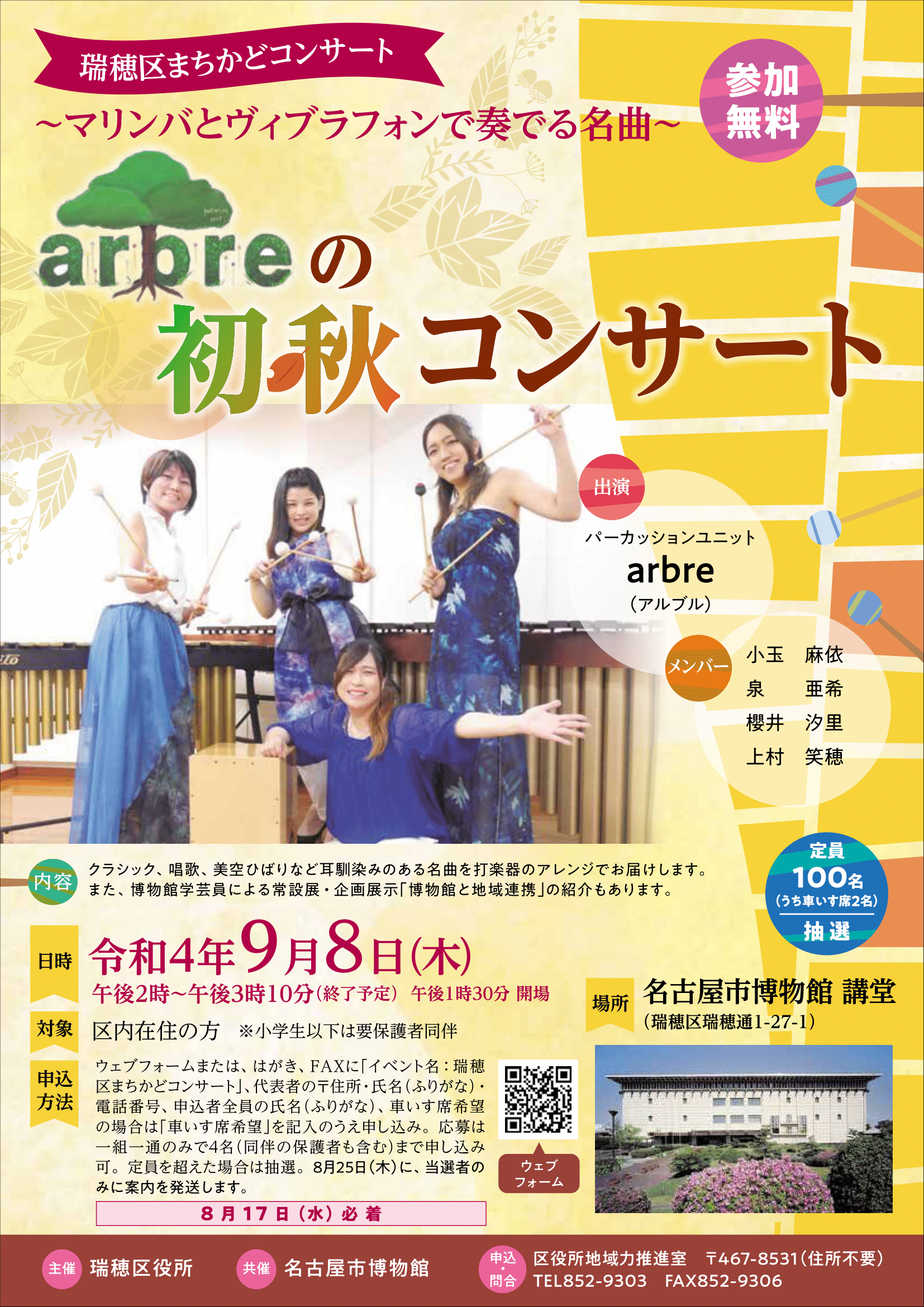 2022年9月8日(木)、瑞穂区まちかどコンサート「パーカッションユニットarbreの初秋コンサート」-マリンバとヴィブラフォンで奏でる名曲-が名古屋市博物館で開催です。
