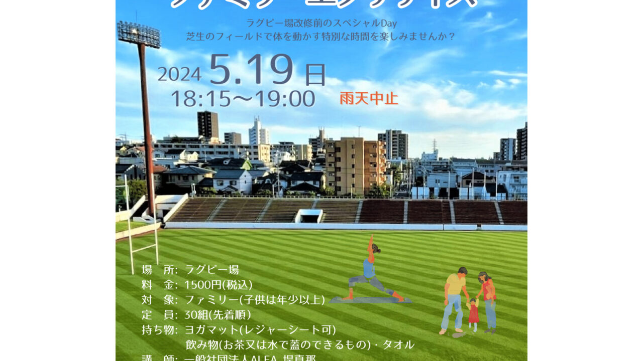 2024年5月19日(日)名古屋市瑞穂区のパロマ瑞穂ラグビー場で『芝生で楽しむ ファミリーエクササイズ』が開催されるようです!