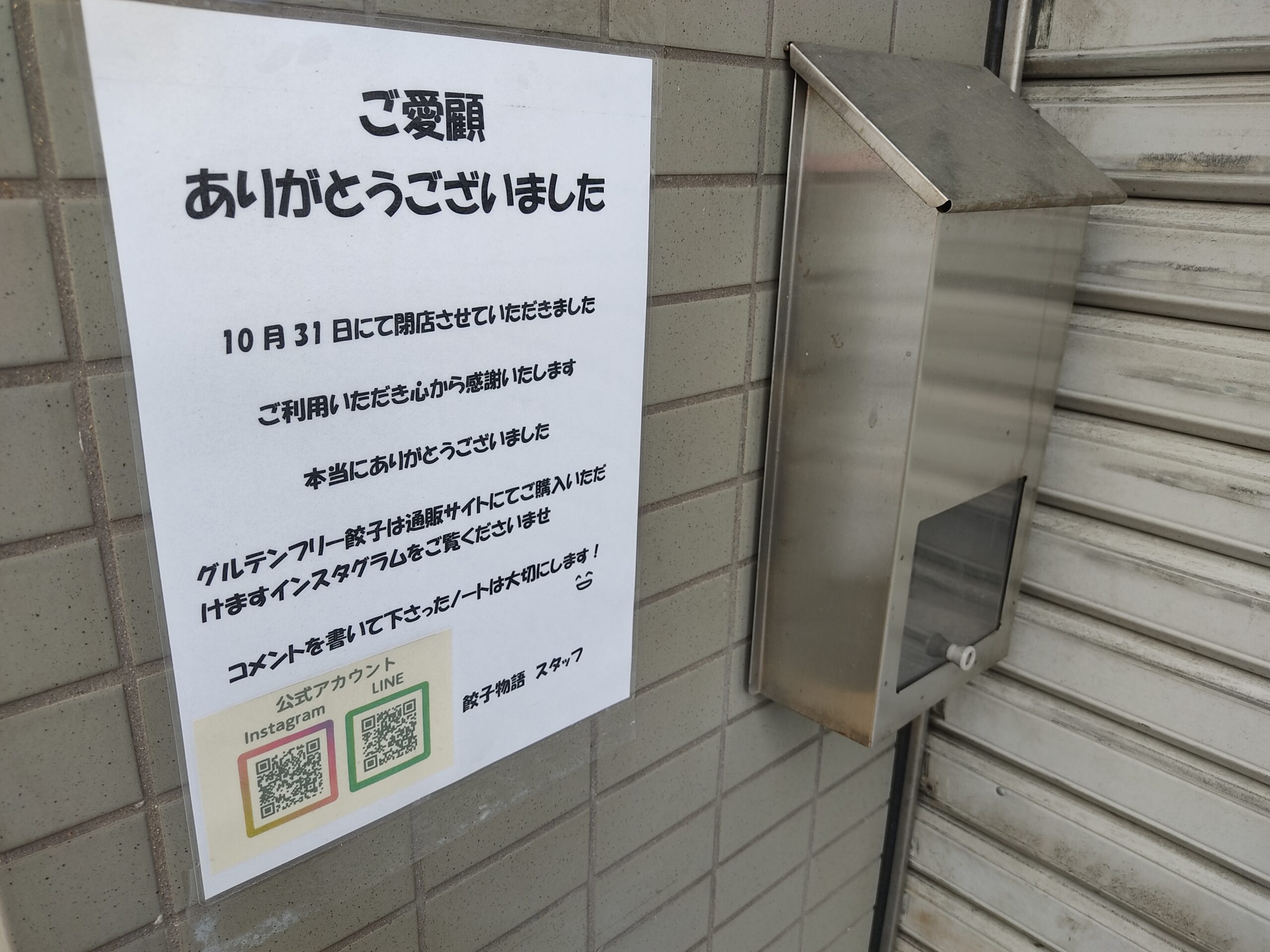 2024年10月31日(木)の営業を持って、新瑞橋で営業していた餃子の無人販売店『餃子物語』が閉店していました。