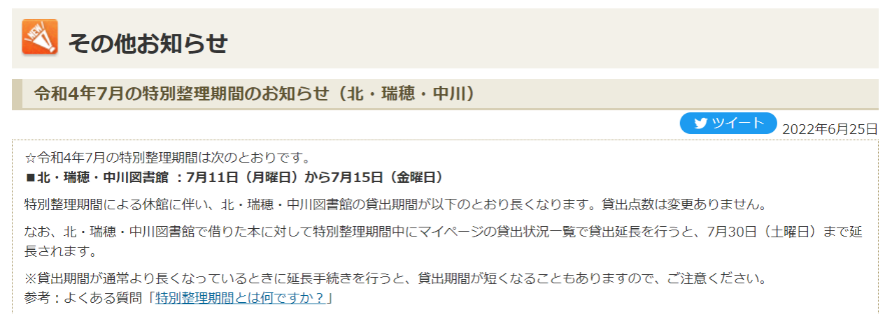 ニュース瑞穂図書館『特別整理』のため7/11(月)~7/15(金)まで休館のようです。【瑞穂区ニュース】 mizuhon 2022年7月10日 / 2022年7月10日 2022年7月11日(月)~15日(金)の間、瑞穂図書館は『特別整理』のため休館のようです。 ↓名古屋市図書館のホームページにお知らせが出ていました↓ ご利用を予定していた方はお気を付けください!! 最新情報や詳細は名古屋市図書館ホームページをチェックしてみてくださいね↓【令和4年7月の特別整理期間のお知らせ(名古屋市図書館)】 【瑞穂図書館】 住所:名古屋市瑞穂区豊岡通3丁目29 *この記事情報は2022年7月9日現在のものです。 *詳細につきまして運営元へご確認ください。 ニュース 瑞穂区 瑞穂図書館