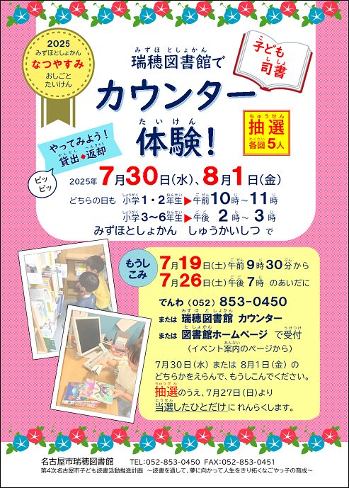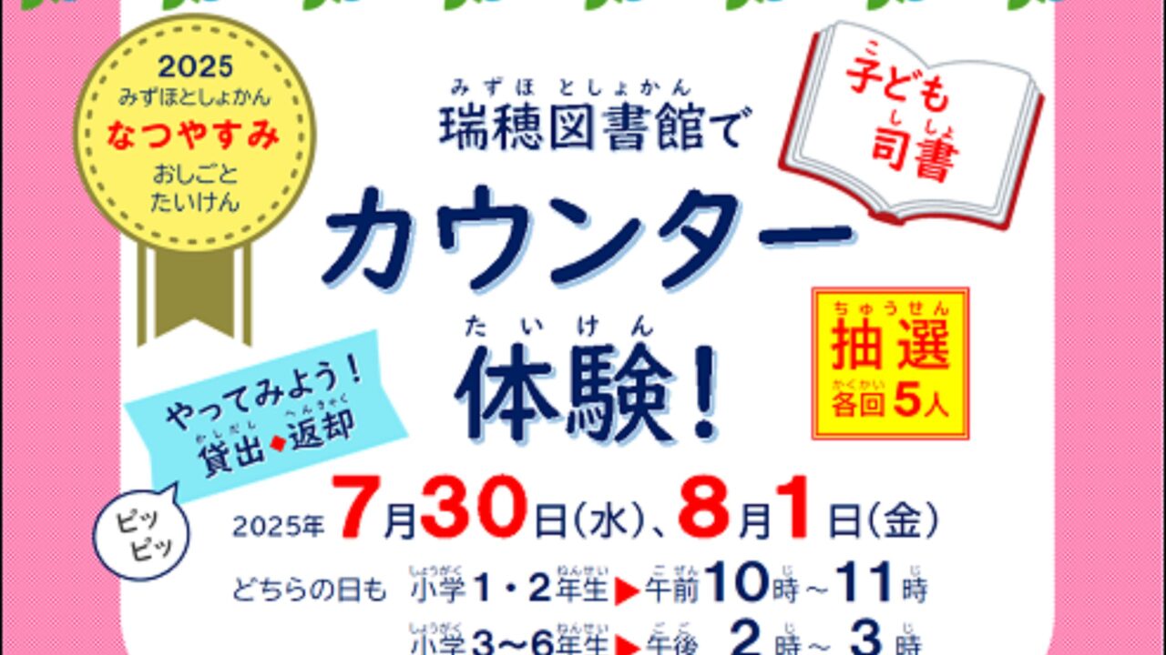 2025年7月30日(水)、8月1日(金)瑞穂図書館で『「子ども司書」カウンター体験!』が開催されるようです!