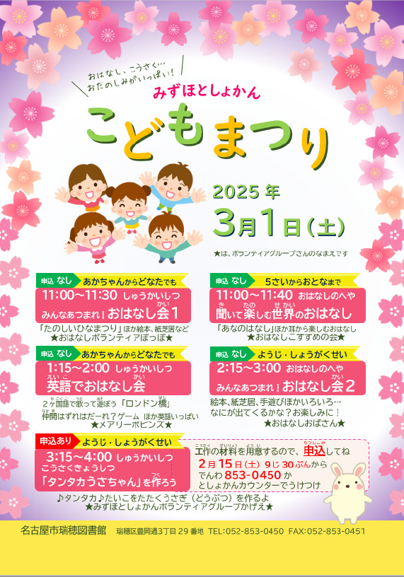 イベント3/1(土)『瑞穂図書館こどもまつり』が開催!【瑞穂区イベント】 mizuhon 2025年2月17日 / 2025年2月17日 2025年3月1日(土)瑞穂図書館で『瑞穂図書館こどもまつり』が開催されるようです! 場所は瑞穂区民の憩いの場所。瑞穂図書館。 ↓詳しい場所はこちら↓ *この画像は公式ページからの転載です。 おはなし会や工作教室など子ども達が楽しめるお祭りのようですね。ぜひ、このチャンスに足を運んでみるのはいかがでしょうか? *この記事情報は2025年2月14日現在のものです。 *詳細につきましては主催者へご確認ください。 *トップ画像は瑞穂図書館HPからの転載です。 イベント 瑞穂図書館