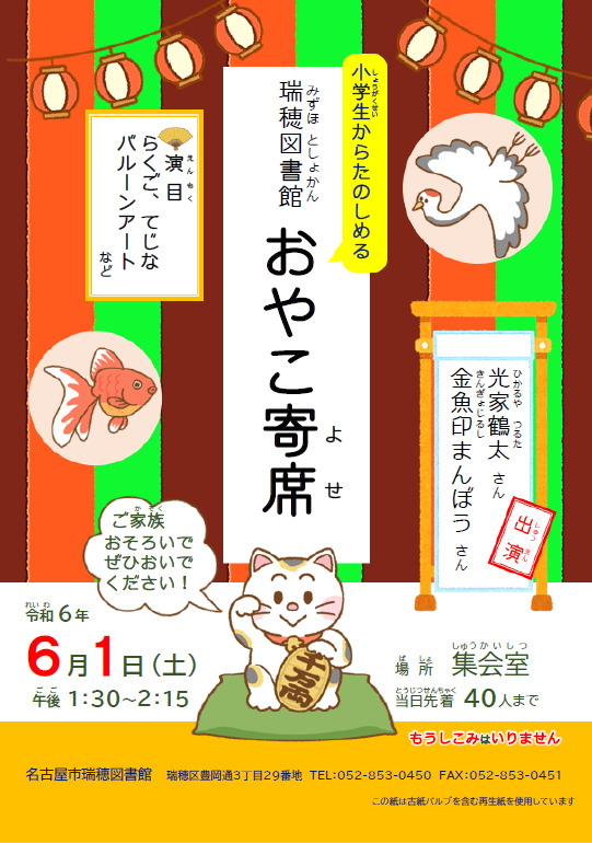 イベント6/1(土)『瑞穂図書館おやこ寄席』が開催されるみたい!【瑞穂区イベント】 mizuhon 2024年5月20日 / 2024年5月20日 2024年6月1日(土)『瑞穂図書館おやこ寄席』が開催されるようです! 場所は瑞穂区民の憩いの場所。瑞穂図書館。 ↓詳しい場所はこちら↓ *この画像は公式ページからの転載です。 当日は落語だけでなく、手品、バルーンアートなども楽しめるようです!ぜひ、お子さんと一緒にご家族で足を運んでみるのはいかがでしょうか? *この記事情報は2024年5月17日現在のものです。 *詳細につきましては主催者へご確認ください。 イベント 子育て 瑞穂図書館