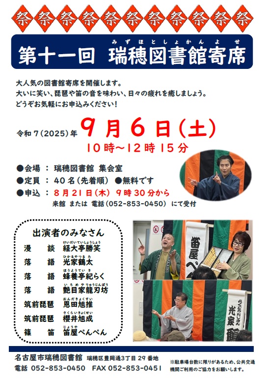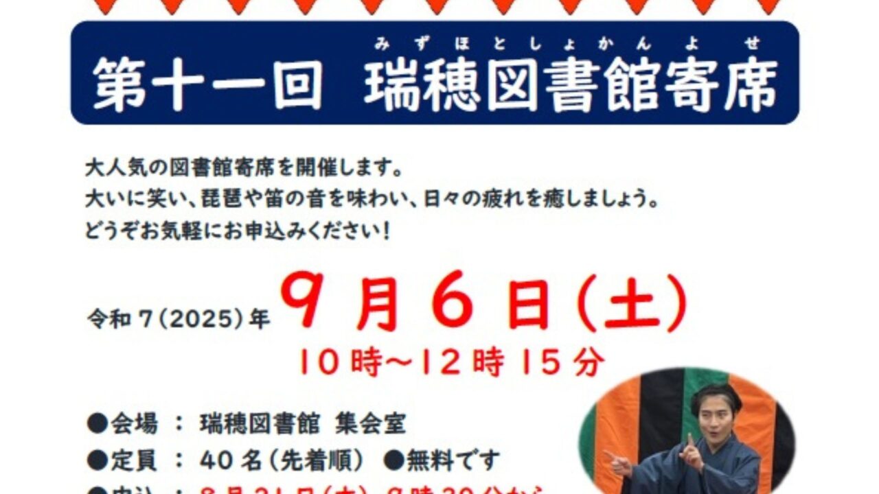 イベント9/6(土)『瑞穂図書館寄席』が開催されるみたい!【瑞穂区イベント】 mizuhon 2025年8月29日 / 2025年8月29日 2025年9月6日(土)『瑞穂図書館寄席』が開催されるようです! 場所は瑞穂区民の学びの中心。瑞穂図書館。 ↓詳しい場所はこちら↓ *この画像は公式ページからの転載です。 当日は落語だけでなく、琵琶や篠笛なども楽しめるようです!ぜひ、足を運んでみるのはいかがでしょうか? *この記事情報は2024年5月17日現在のものです。 *詳細につきましては主催者へご確認ください。 イベント 瑞穂図書館