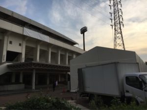 ラグビー場の内部に紫の幕がかけられていました。