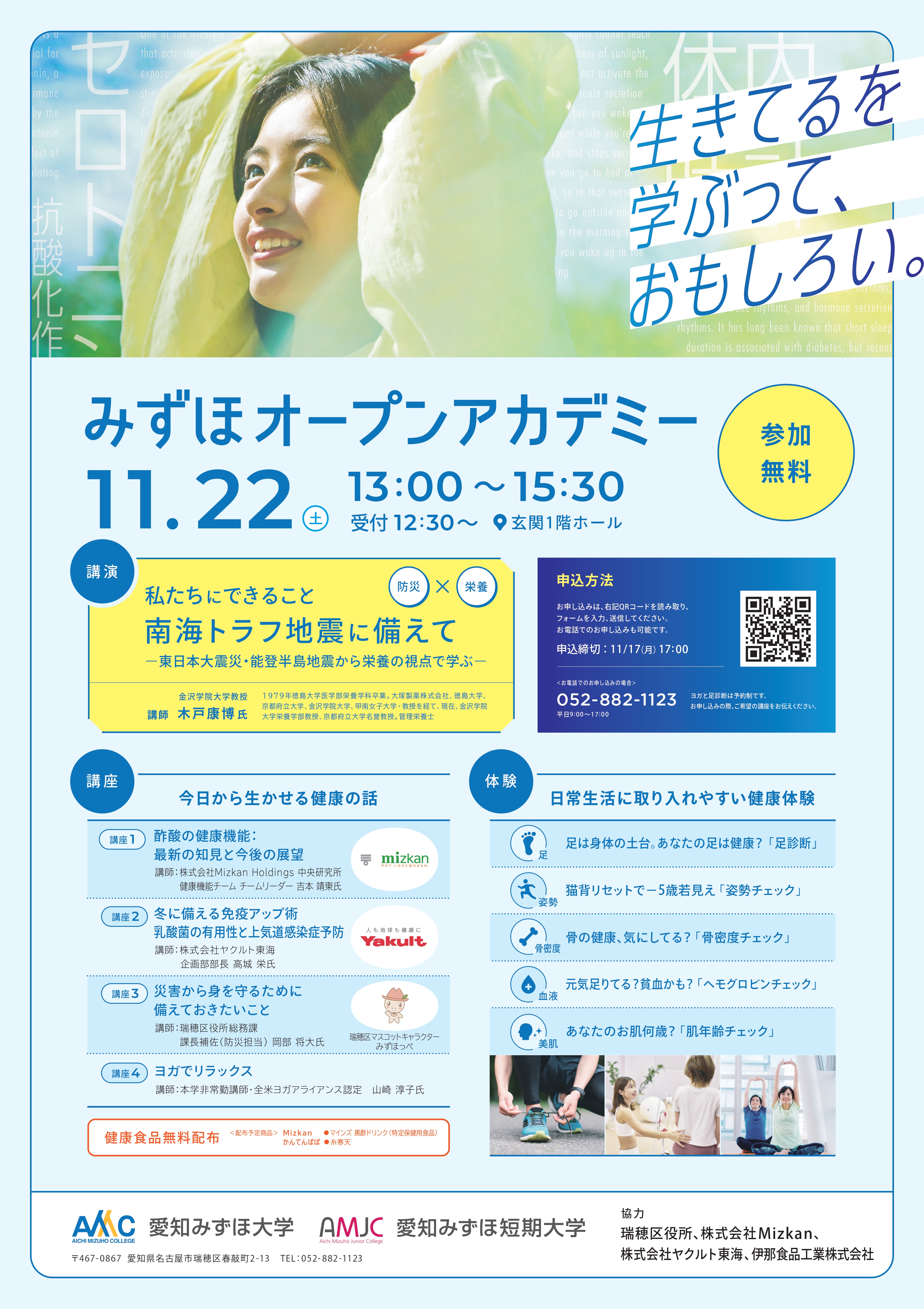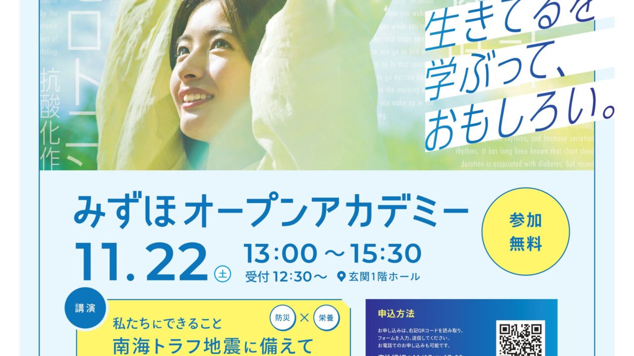 イベント11/22(土)『みずほオープンアカデミー』愛知みずほ大学で開催!【瑞穂区イベント】 mizuhon 2025年11月13日 2025年11月22日(土)瑞穂区・牛巻交差点近くにある、愛知みずほ大学で『みずほオープンアカデミー』が開催されます。 防災×栄養という視点からの講座が開催されます。面白そうなテーマ!!参加無料ですが、事前申し込みが必要となります。申し込みや詳細は公式サイトをご確認ください。 *この記事情報は2025年11月13日現在のものです。 *詳細につきましては主催者へご確認ください。 イベント