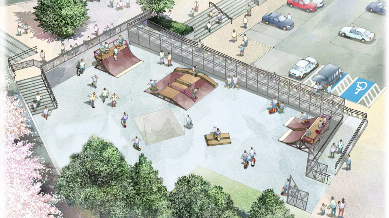 ラグビー場の前にある広場には『スケートボードエリア』が計画されていました!