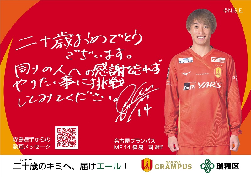 そんな瑞穂区の新成人の方々に向けて、名古屋グランパス『森島司選手』とHC名古屋『茂木咲良選手』からのお祝いメッセージが公開されていました!!