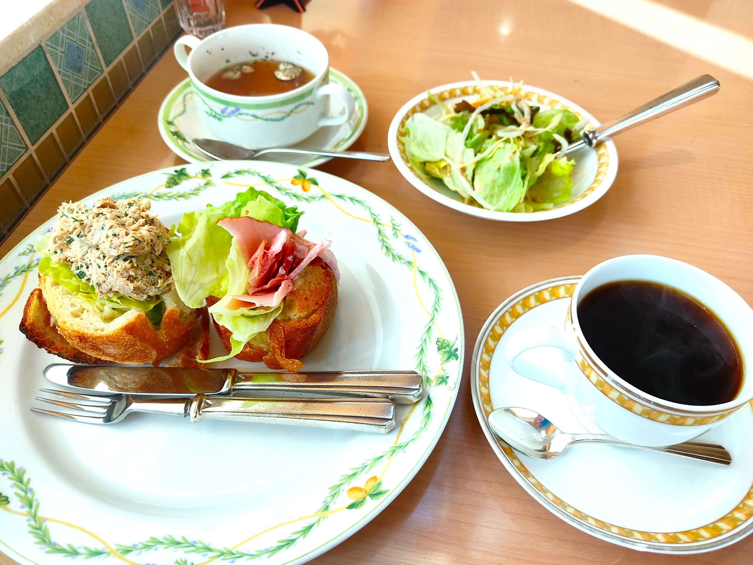 上品なコンソメスープとサラダが朝の身体に染みわたります…