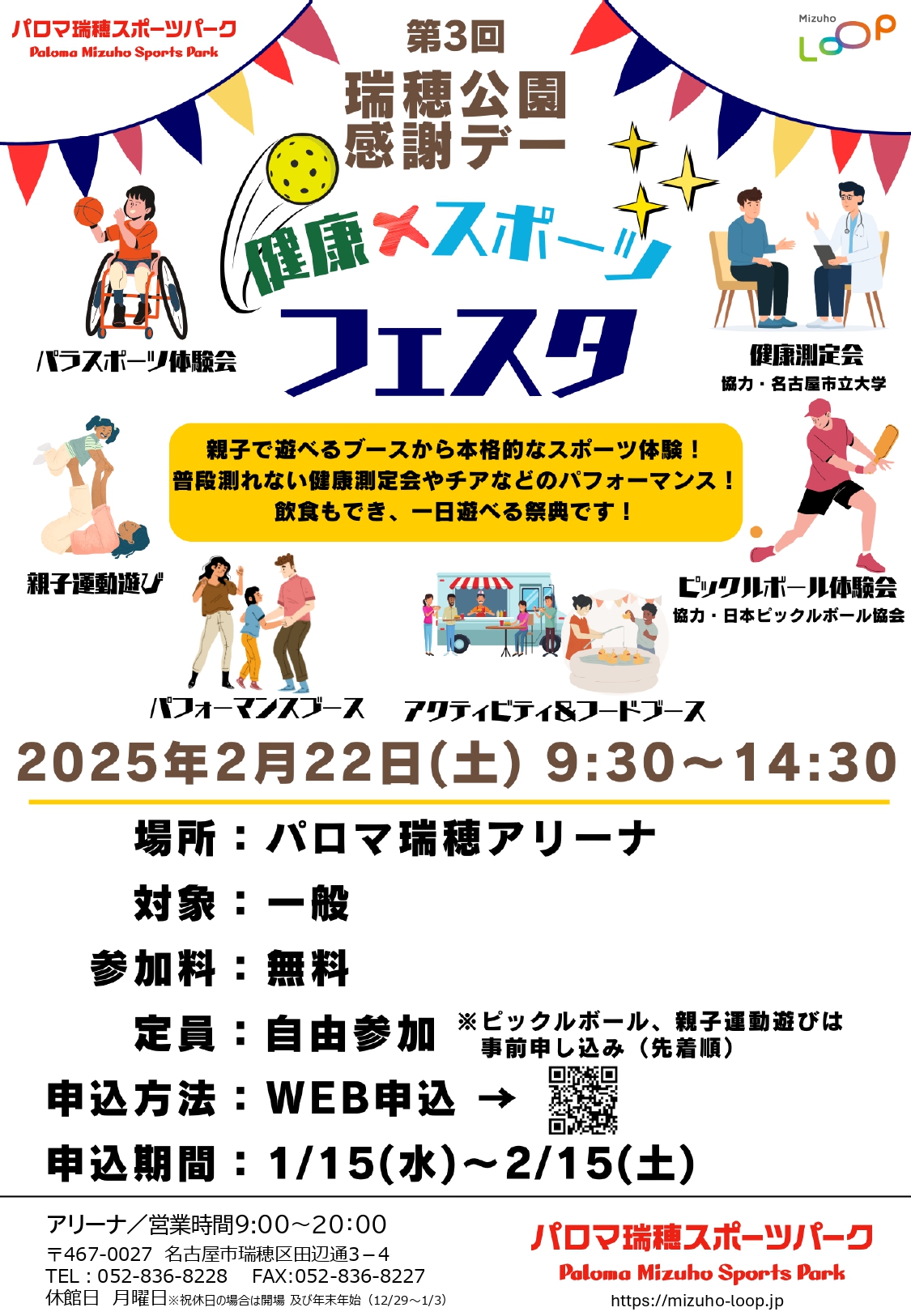 2025年2月22日(土)パロマ瑞穂アリーナで『瑞穂公園感謝デー「健康×スポーツフェスタ」』が開催です!!