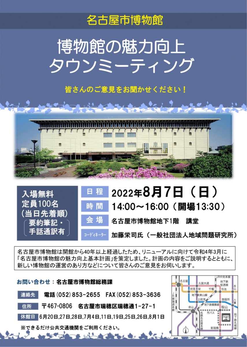 2022年8月7日(日)、名古屋市博物館で『博物館の魅力向上タウンミーティング』が開催されます!!