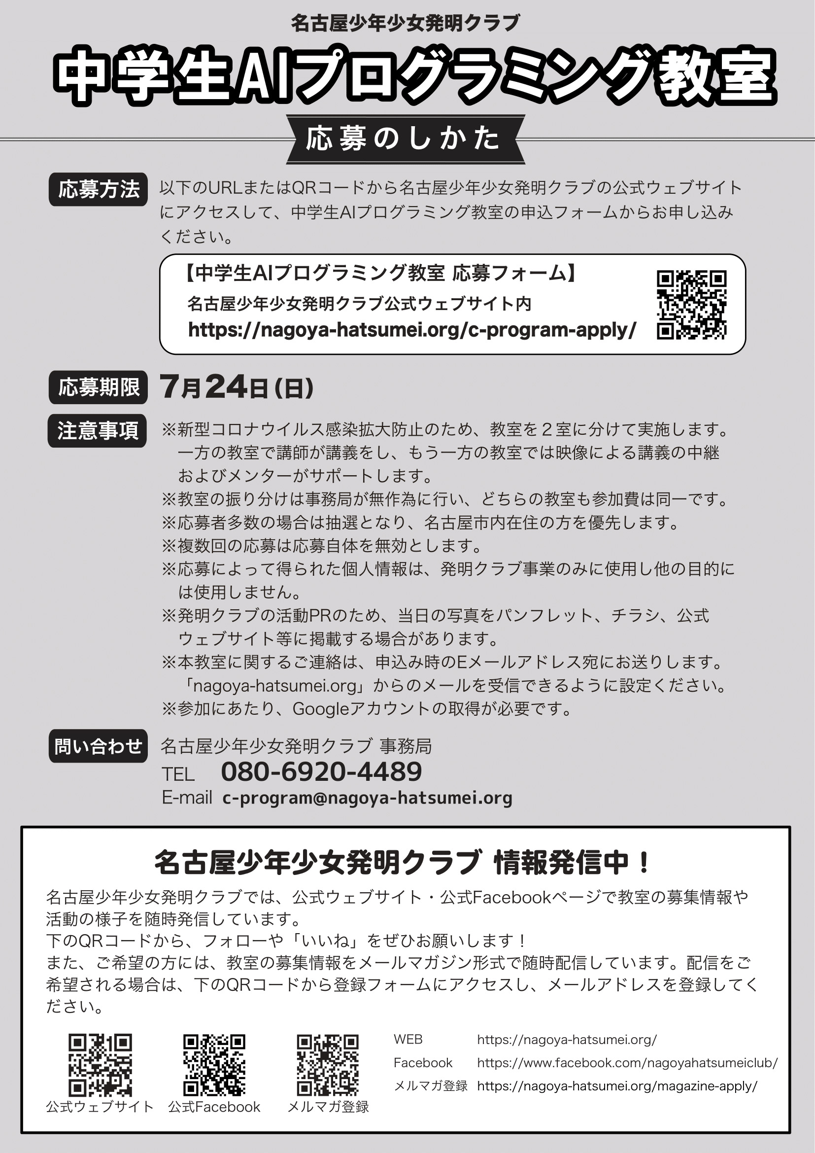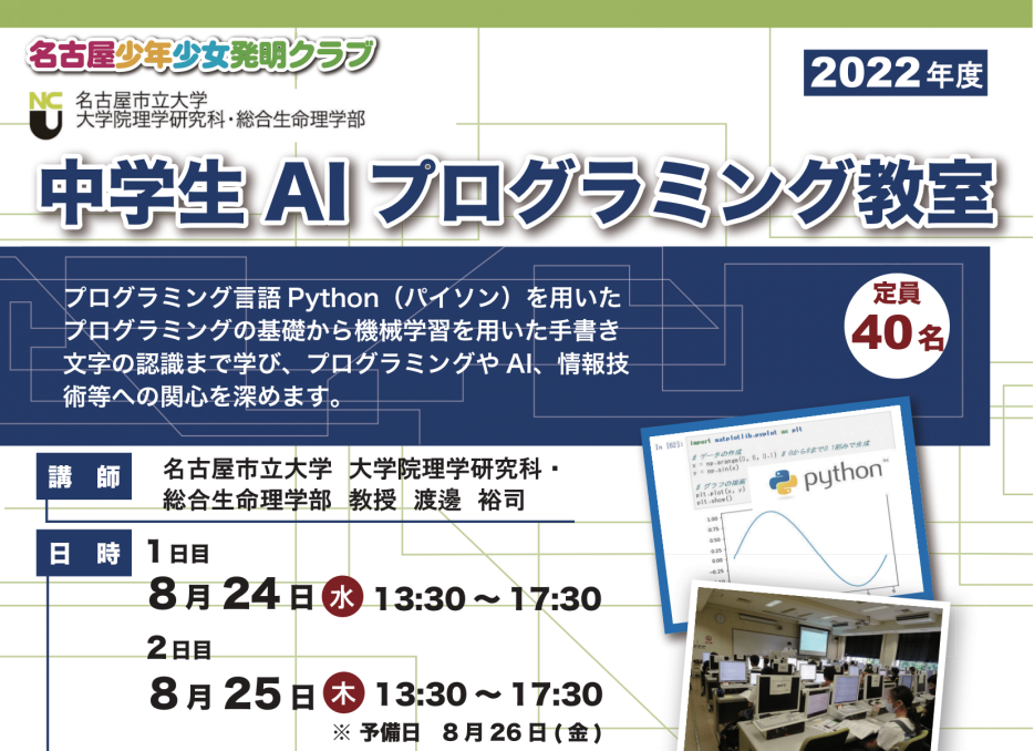 イベント名市大『中学生AIプログラミング教室』8/24(水)から開催されるみたい【瑞穂区イベント】 mizuhon 2022年7月19日 / 2022年7月19日 2022年8月24日(水)~25日(木)の期間、名古屋市立大学滝子キャンパスで『中学生AIプログラミング教室』が開催されるようです!! ↓チラシはこちら↓ *この画像は名古屋市立大学ホームページからの転載です。 とても面白そうなイベント!!!中学生の方たちにとって、AIやプログラミングへ取り組むきっかけになるような教室ですね!!詳細や申し込み方法はこちらをご確認ください↓【中学生AIプログラミング教室(名市大ホームページ)】 *この記事情報は2022年7月16日現在のものです。 *詳細につきましては主催者へご確認ください。 イベント 子育て 瑞穂区
