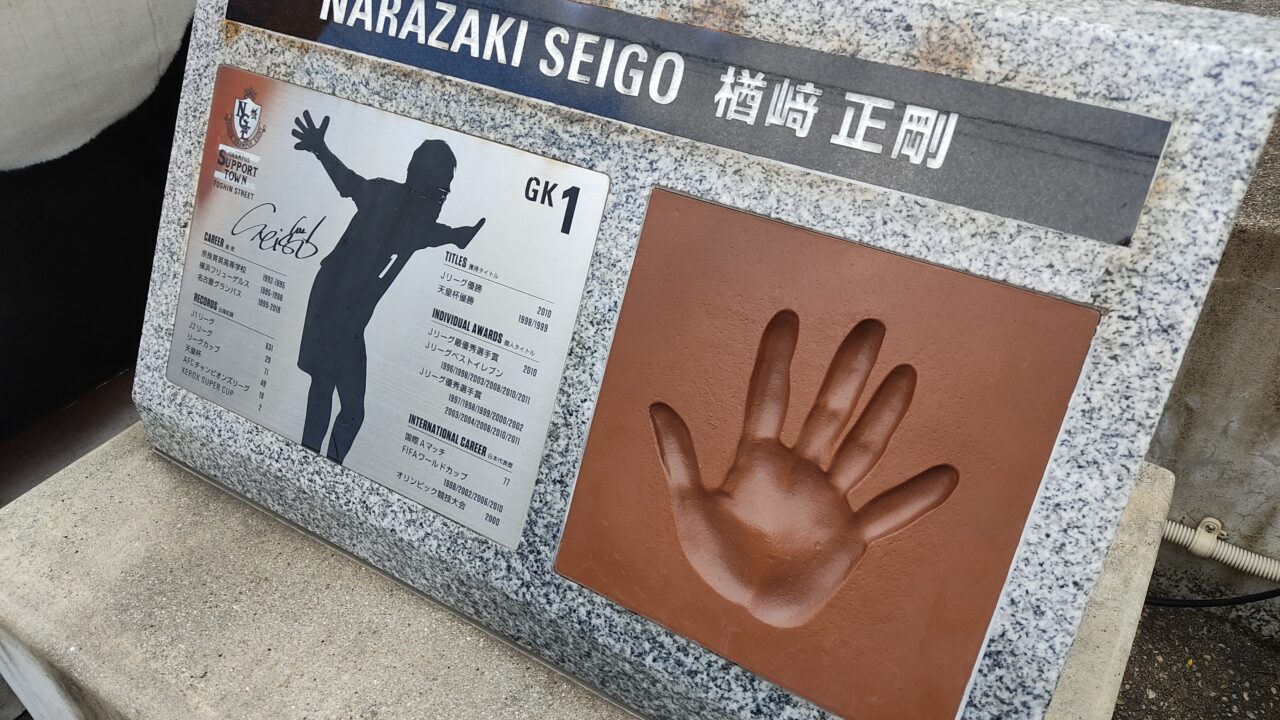 その中に急に現れるのは元日本代表 楢崎正剛選手(現名古屋グランパスゴールキーパーコーチ)のモニュメントと手形!!
