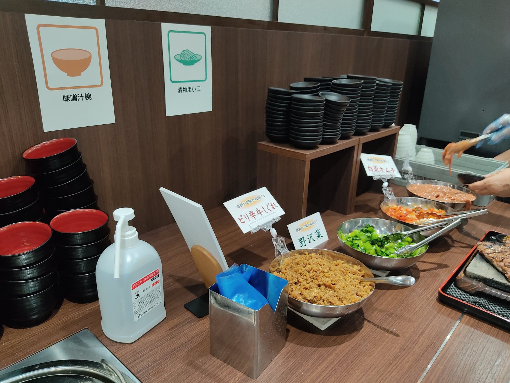 肉そぼろ、野沢菜、キムチ、イカの塩辛があったのですが、どれも美味しい!