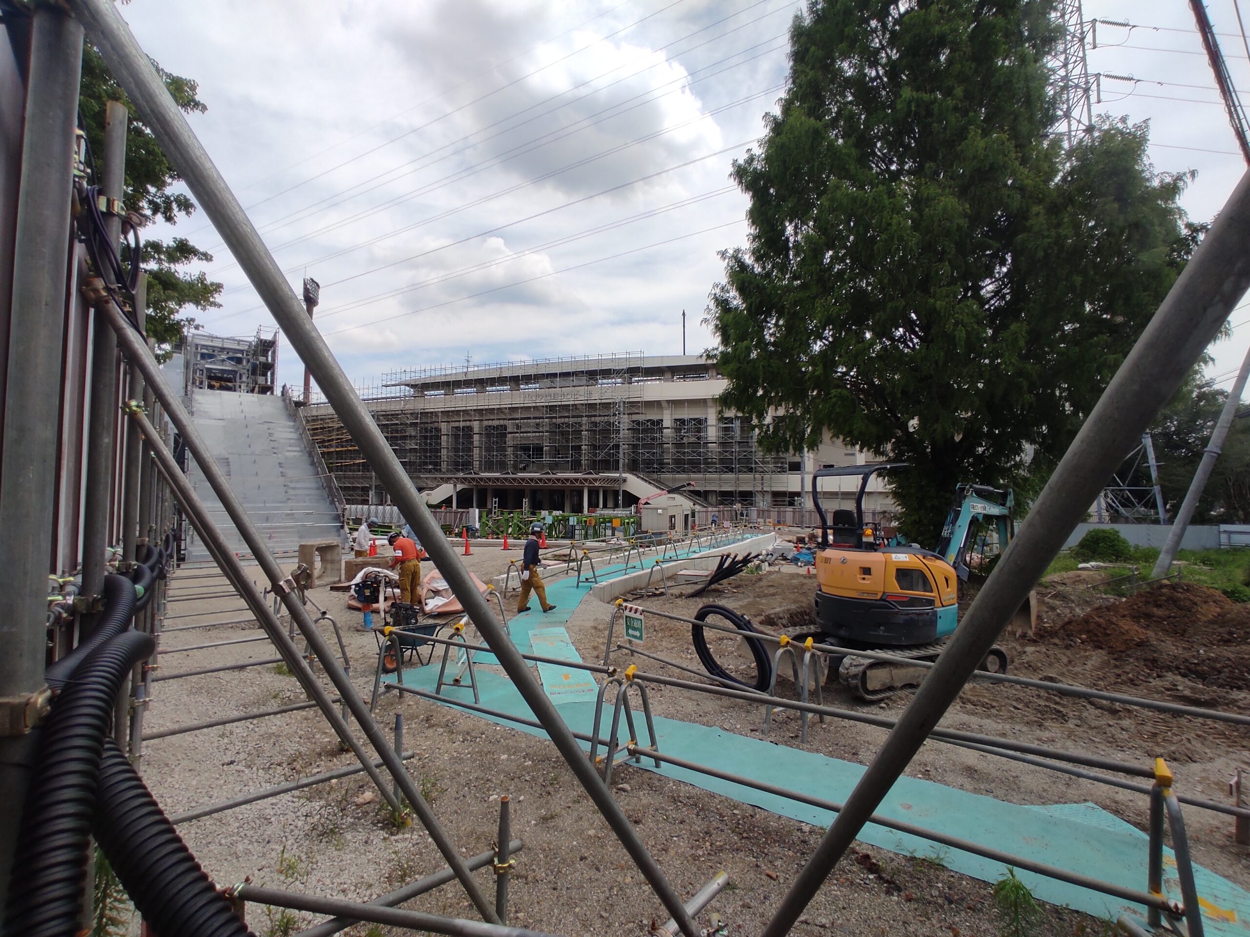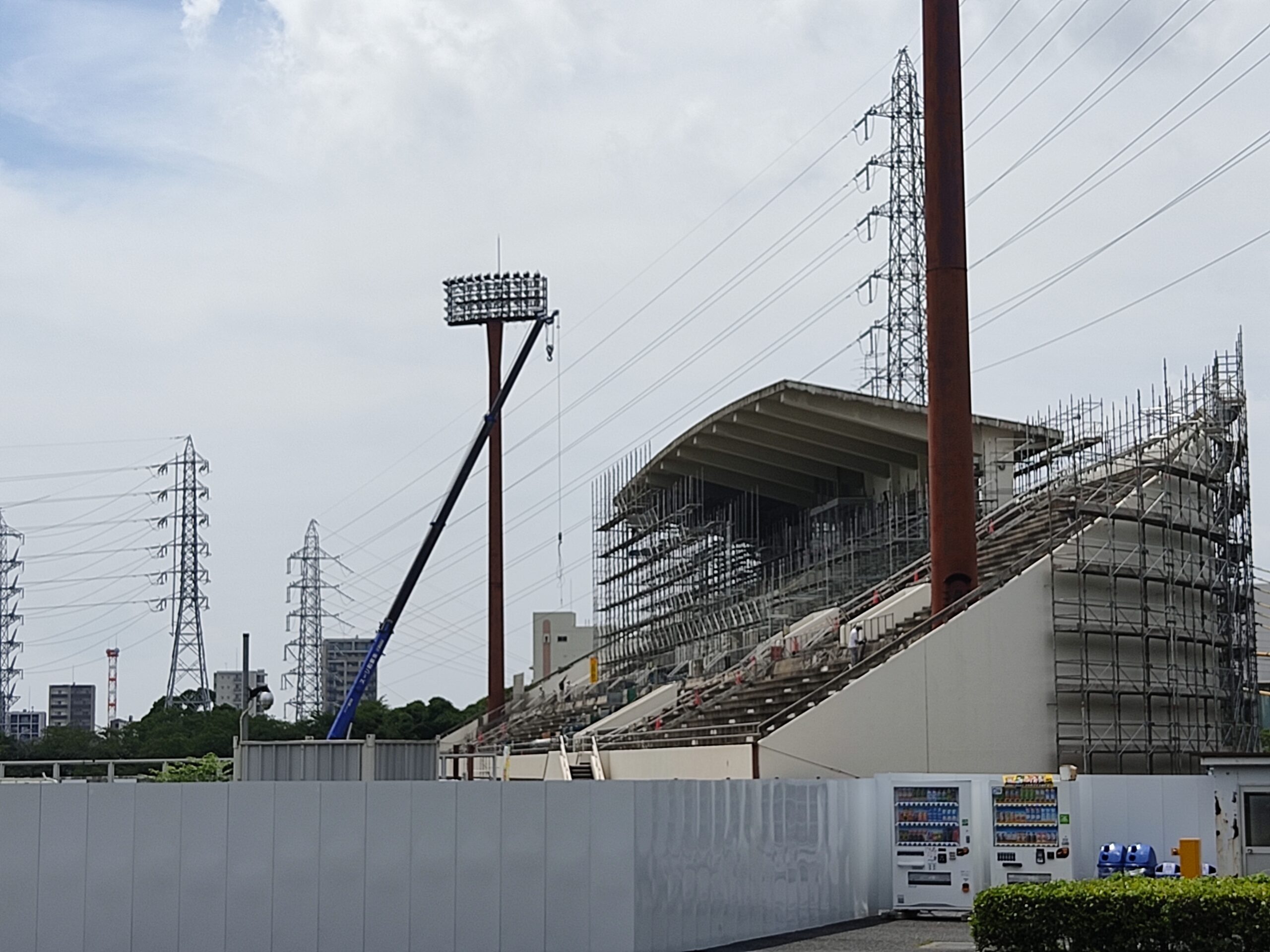 メインスタンドにも足場が組まれ、改修が進んでいました。